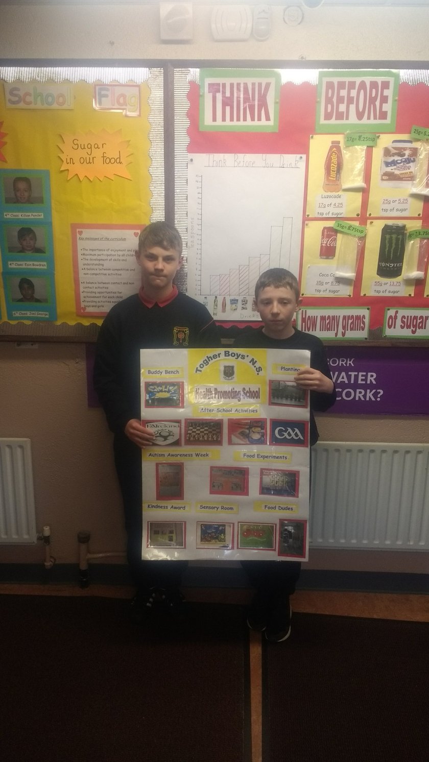 The boys will go to City Hall on May the 14th to receive an award for Togher BNS participating in the Health Promoting School Programme. Ms Eade and Ms O Connor will accompany two third class boys for the ceremony. Well done to everyone who has helped us become more healthy.