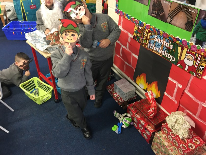 During Aistear time, the boys got into the roles of Santa and his elves, fixing broken toys and wrapping lots of gifts at the workshop. They engaged in wonderful Christmas art and craft activities, making some Christmas decorations as well as jolly Santa faces.