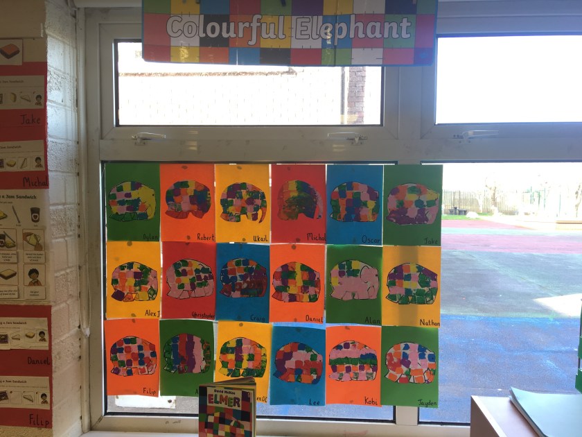 In maths, we were learning about 2d shapes and patterns. We linked these two areas with our Aistear theme, and the children made some delicious 2d shape patterned pizzas. The boys also made their own print patterns using a variety of stamps, and through our class story ‘Elmer’ we made our own multicoloured pattern elephants too. I am always encouraging the boys to use lots of colours in their work as opposed to just their favourite colour, and these activities certainly helped.
