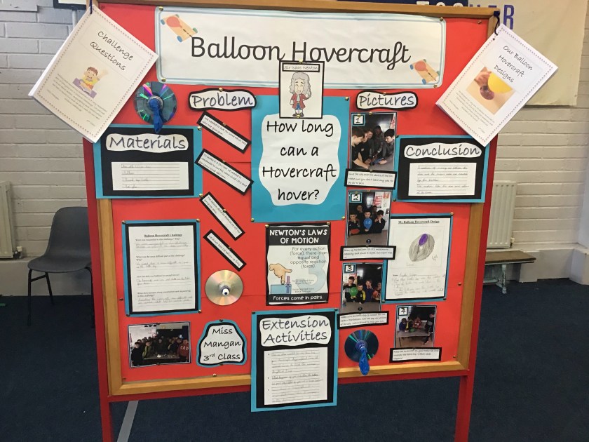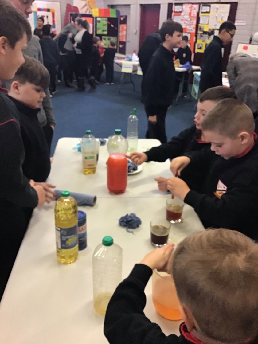 I saw a couple of people demonstrating their classes science projects. There were experiments about dancing raisins, optical illusions, how the air from fizzy drinks can inflate a balloon or rubber gloves. You could make an instrument out of a straw. There was a DVD, a bottle cap and an inflated balloon put together to make it hover like an aircraft. Also there were DIY boats that could float. There was an electric tube that was powered by humans and water together. You could write your name out of lemon juice and it turned brown when heated. You could make a rainbow using skittles and hot water. Senior infants were showing about materials that were waterproof. Next we had different types of bridges. They had some pretty cool bridges made by second class that took a lot of effort. Next we had senior infants showing us how paint will not mix when water is added. Then we had oublack (slime) made by fifth class. We also saw how they cleaned copper coins using household materials. There was also information about climate change on the walls for us to read. I liked the whole day. It was very enjoyable.
