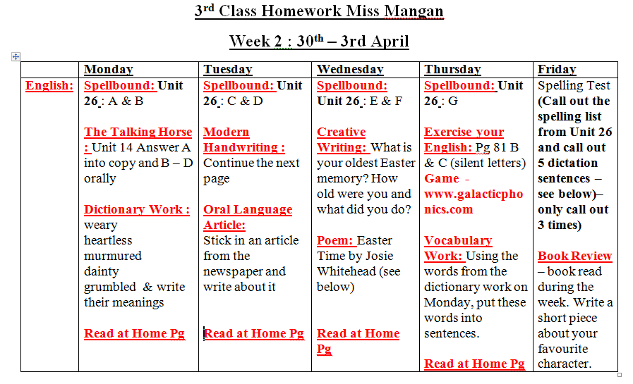 I hope that you all had a good week and that you managed with the homework. I do want to take this opportunity to thank each and every one of you for your continued support and patience through this very difficult time and know that I hugely appreciate it. As I mentioned last week, try to complete each day as best you can and if the work given is proving stressful in any way, please take a break from it. If you have any questions or encounter any difficulties with the work, please don’t hesitate to email me at yvonnemangan10@gmail.com. I will be in contact with you again over the coming week.