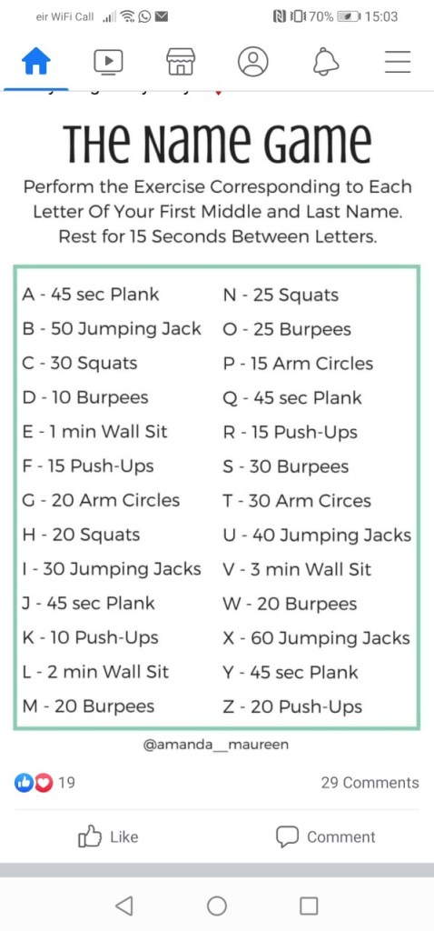 - RTE Junior have several 10-minute work outs that the children love to do https://rtejr.rte.ie/10at10/