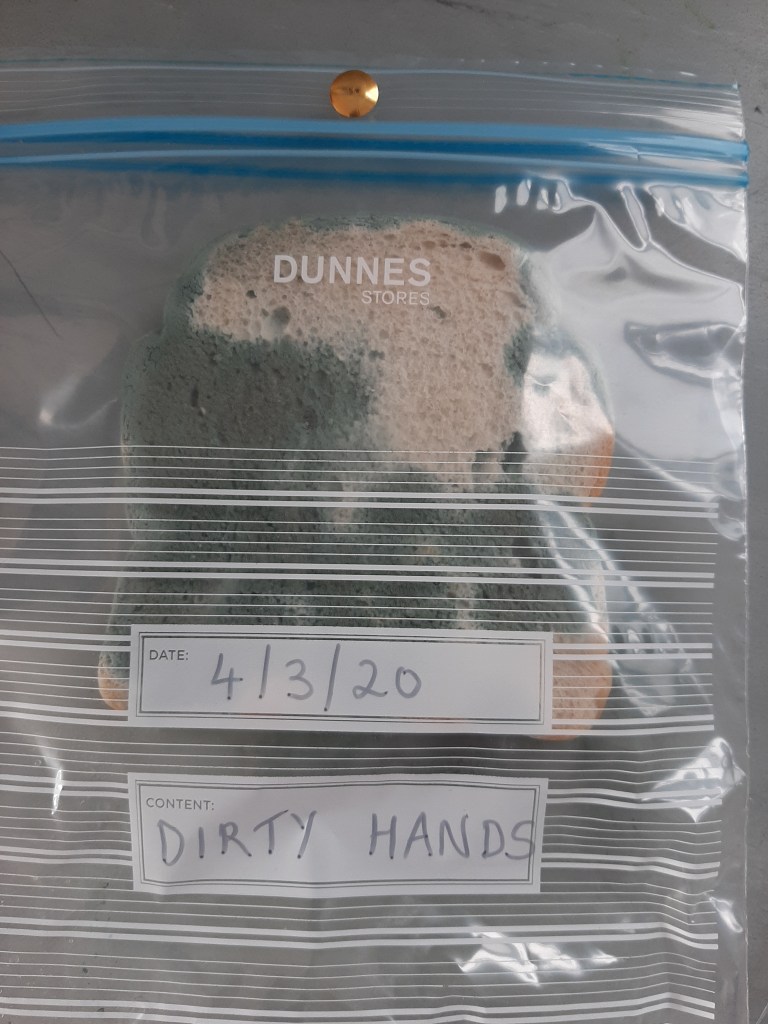 - Next, every student carefully washed their hands with soap and water, dried them, used hand sanitiser and then held their hands high in the air, being sure not to touch anything. We passed another slice of bread around, and every student’s clean hands touched it. We put it in a sandwich bag marked ‘Clean Hands’.