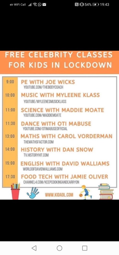 It was great to chat to ye online today! Glad to see ye are doing the work and helping out at home. Keep sending on the pictures and work completed, if ye like! 😊