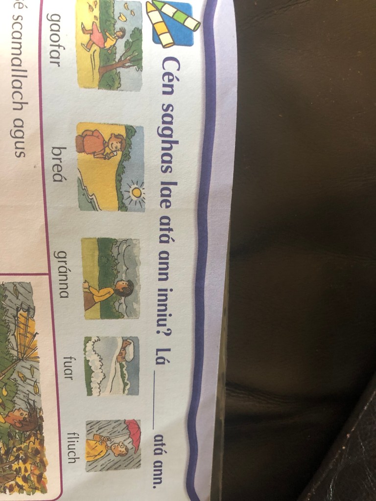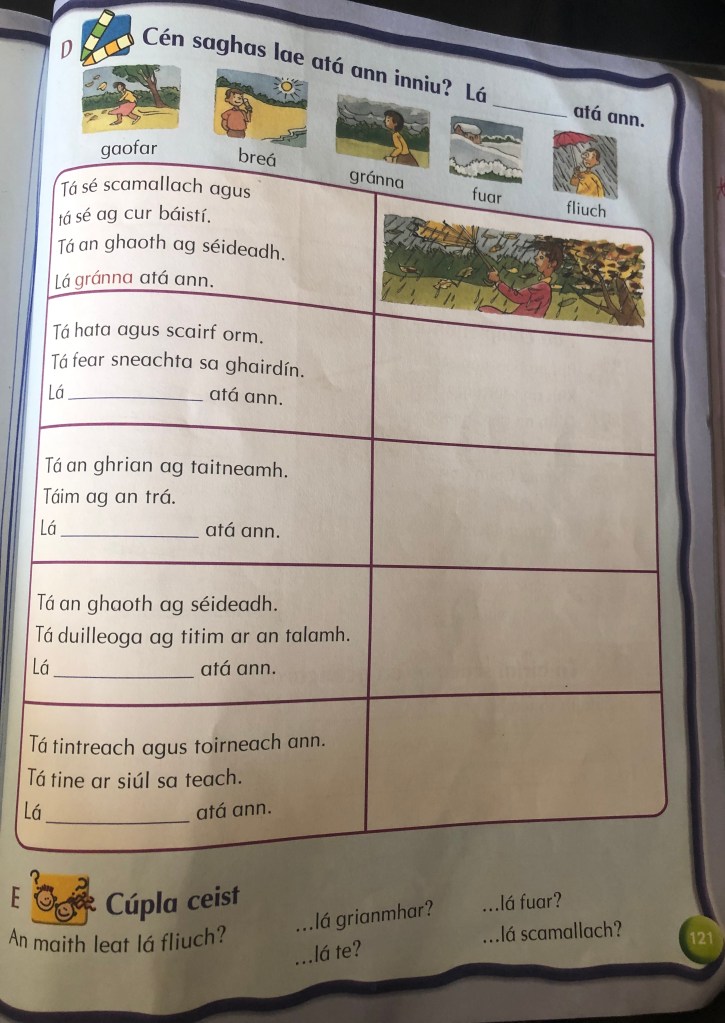 Scríobh; Try this written activity. Use the words you know and the pictures at the top to put the right weather into each description.