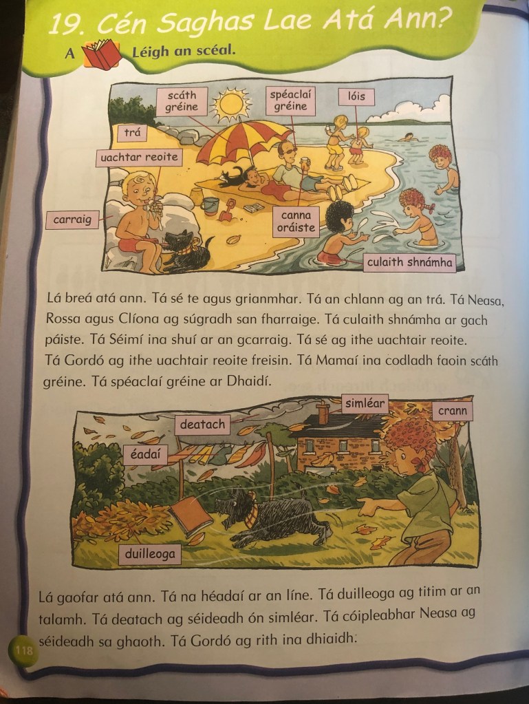 For spelling and litriú, move on to the next unit this week. For English spellings, I would advise taking 4 words a day for 4 days; 16 words in total. For litriú, take 3 words a day for 4 days; 12 words in total.