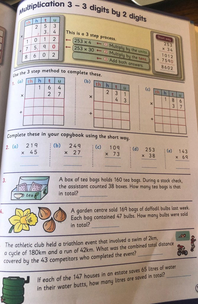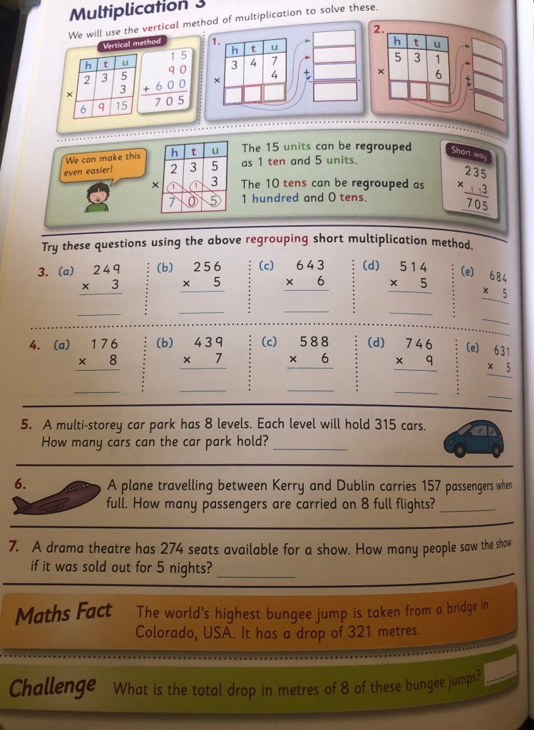 Wednesday: Today we will practice multiplication again. Today however we will be doing long multiplication. Have a look at the video on the class page on Microsoft Teams before you begin. Remember to multiply the top number by the unit of the bottom number first and then multiply the top number by the ten of the bottom number. Don’t forget the magic zero!! The video will help you.