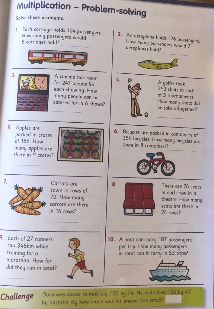 As you all know, these multiplication sums must always be written out downwards. Put the bigger number on top and multiply the unit by the smaller number and then the ten by the smaller number. Don’t forget to carry the ten after multiplying the unit. There are examples on this page and have a go off all the sums on question 3,4 and 5.