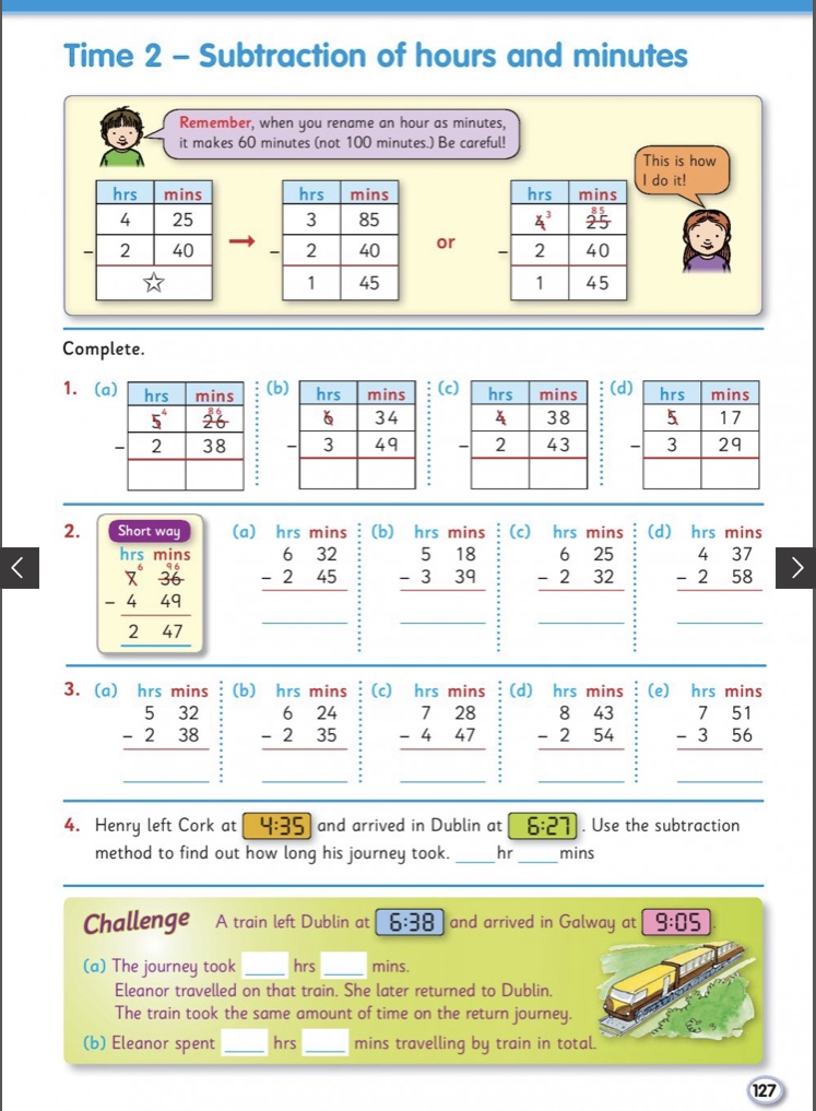 The important thing here is to regroup hours and minutes if the minutes at the top are smaller than the minutes being subtracted. Again there are instructional videos on Teams and examples on the work sheet.