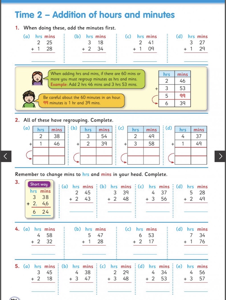 When adding hours and minutes, follow the same steps as adding tens and units. The only thing to remember is if the minutes go over 60 then you must regroup as hours and minutes. There will be example videos on Teams as well as examples on the page.