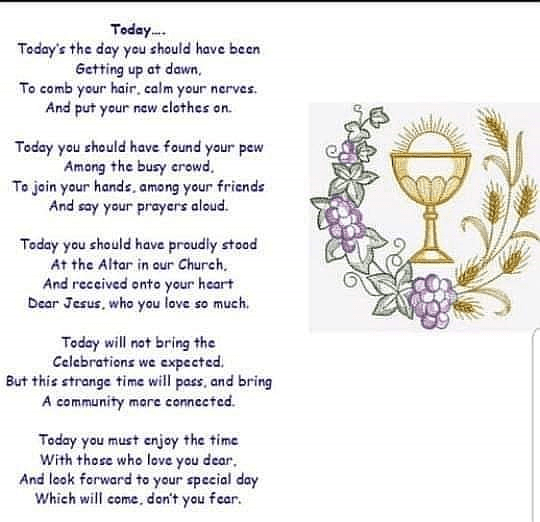 Hello boys, I know this week should have been a very exciting week in school making our final preparations for your First Holy Communion. Unfortunately, we won’t be celebrating this day on Saturday and I know you must be feeling sad about this. It’s normal to be feeling this way boys, but remember that your special day will happen. Like everything else at the moment, it has just been put on hold for a while. I will be thinking of you all on the 16th May. I hope you all do something nice with your families. I am going to give no homework next Monday as a treat!