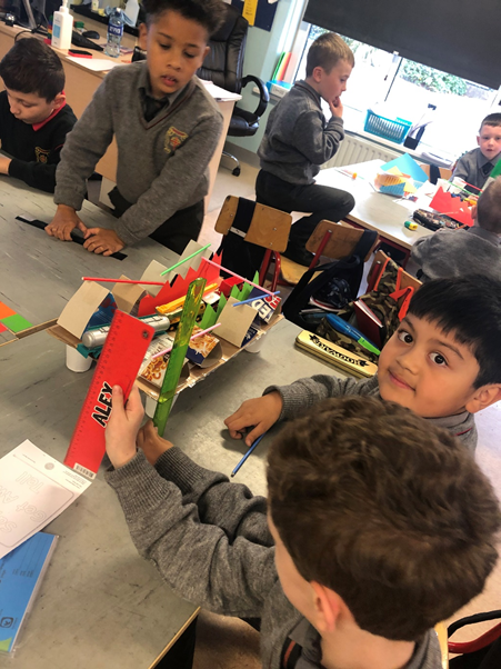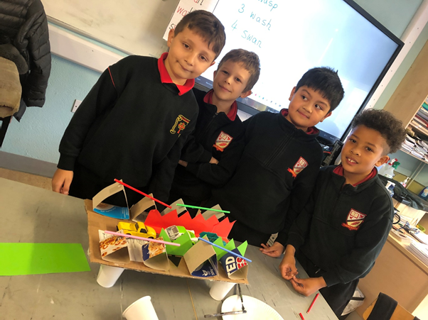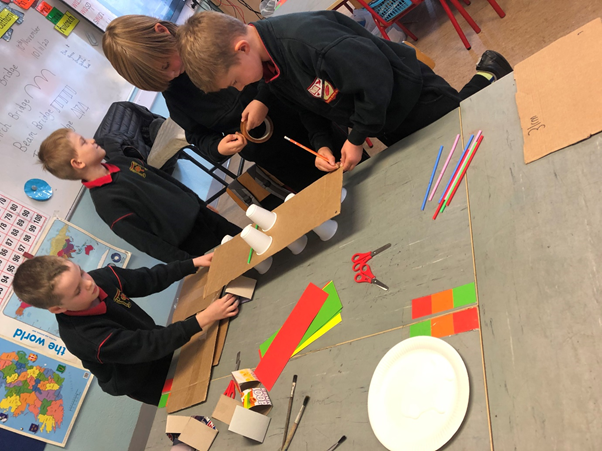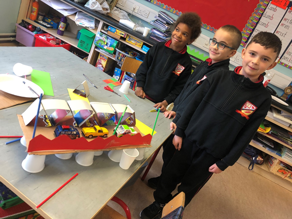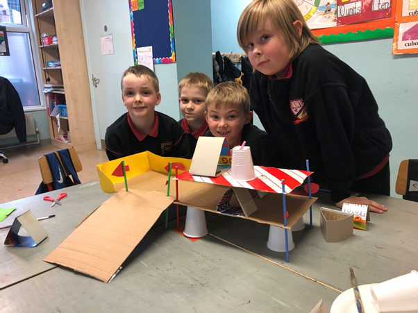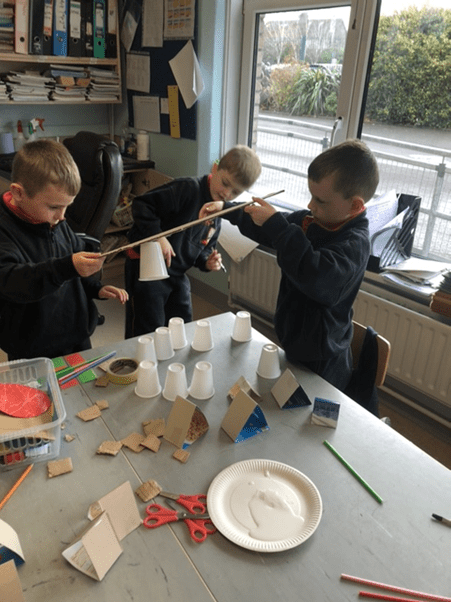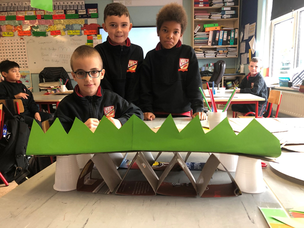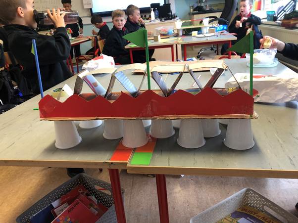 The materials that we used to build our bridges were cardboard, triangular shapes, plastic cups, straws, coloured card, Sellotape, glue, scissors.