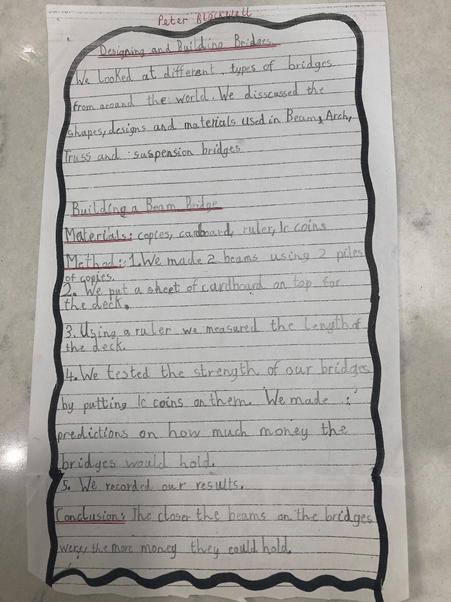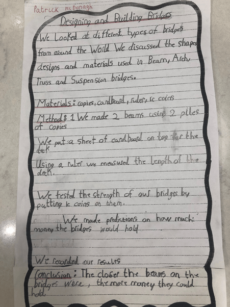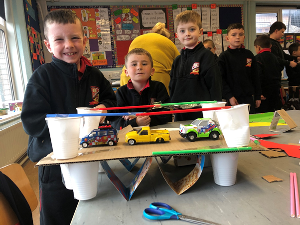 The boys in second class were very busy this week. They worked as engineers to explore the basic physics of bridges. Through experimentation the boys learned which shapes were the most structurally strong. They also learned that many factors need to be taken into account in engineering and building.