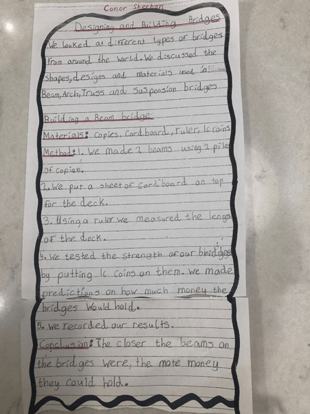 We made our Beam Bridges by using copy books as beams and cardboard as the deck. Using rulers, we measured the length of the deck of our bridges. Following that we tested the strength of our bridges by putting 1 cent coins on them. We made predictions on how much money the bridges would hold. We recorded our results. We concluded that the closer the beams were together, the more money they could hold.