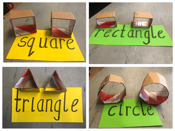 We worked in teams to construct bridges that would hold at least 4 toy cars. Our first step was to test shapes made out of cardboard to see which shapes would be the strongest to use in our designs. We made predictions before we tested. We discovered that the triangle was the strongest shape.