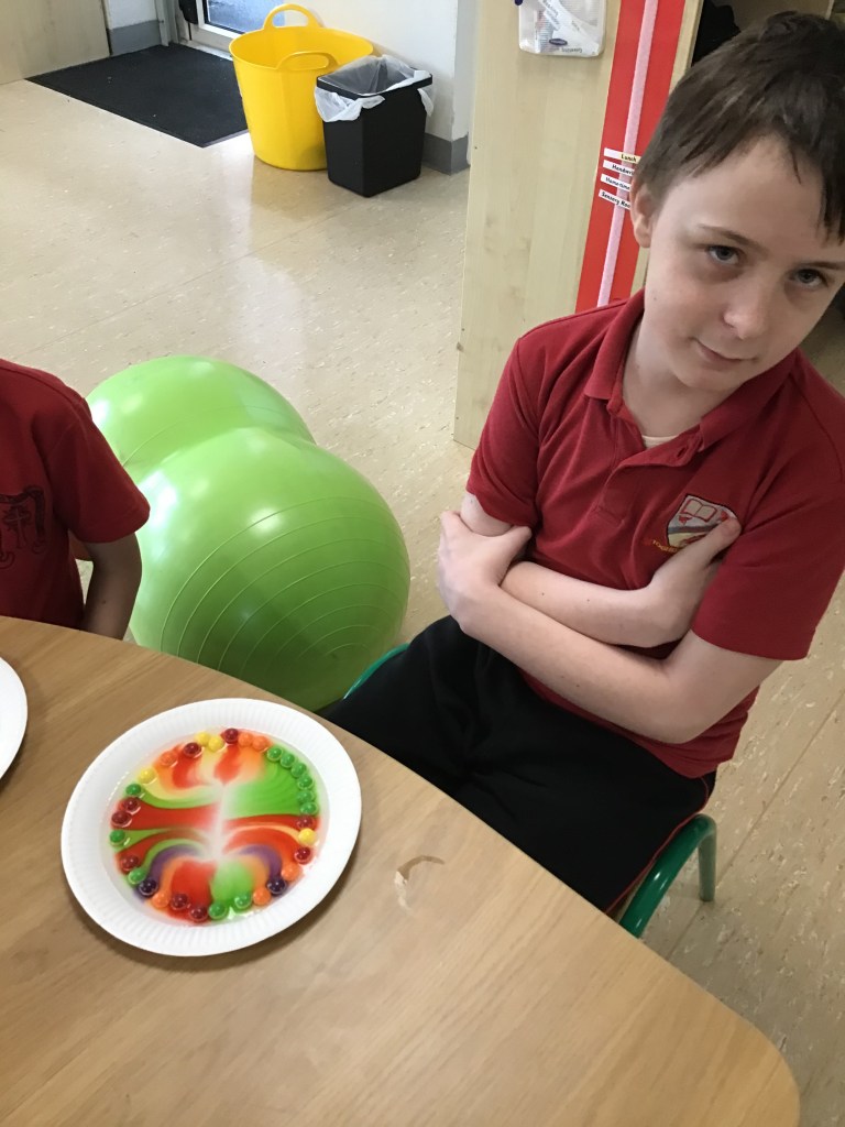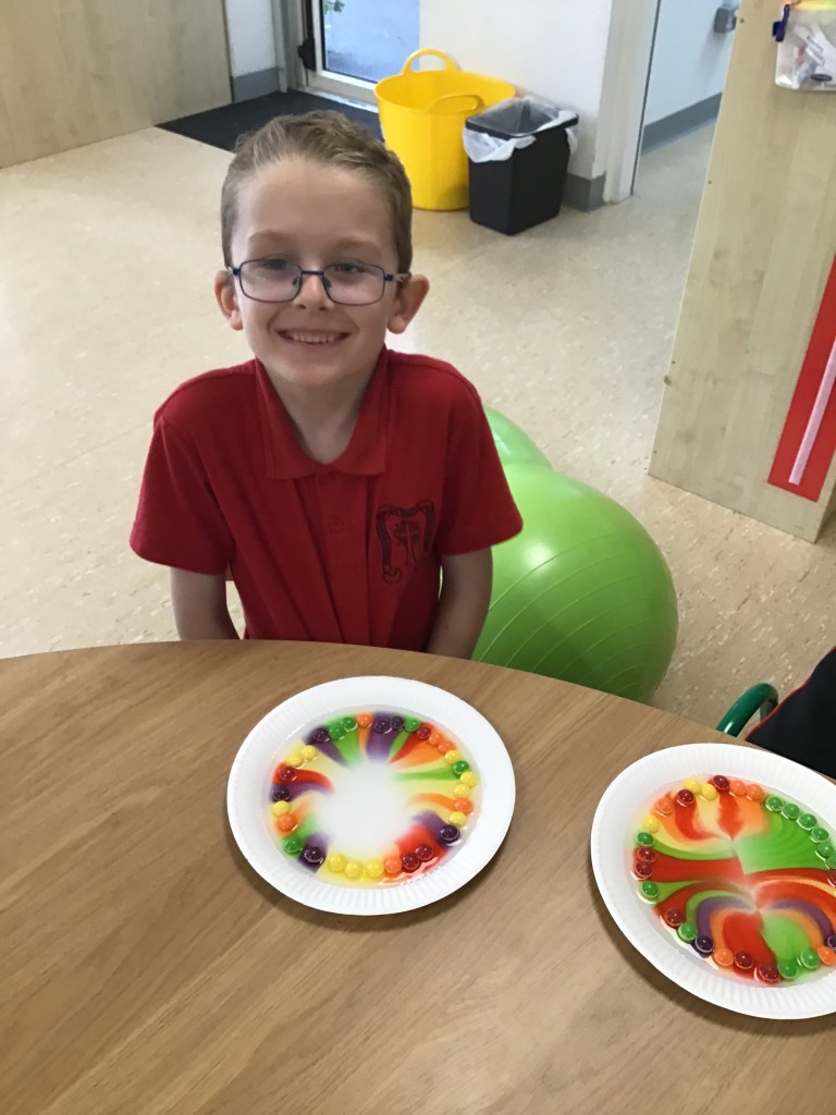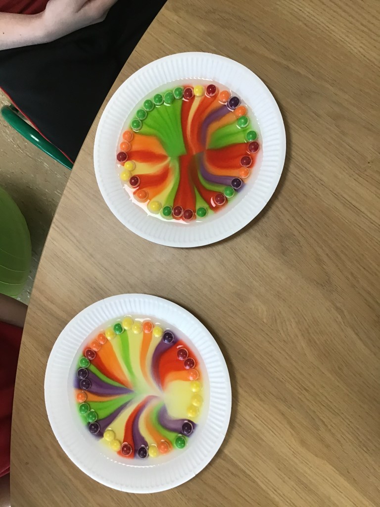 We carried out the ‘Skittles Experiment’ this week. We arranged the skittles around the plate and then slowly poured some warm water on the plate. The warm water caused the food colouring and sugar to dissolve, so the colour spread over the plate. We created beautiful plates of rainbow colours.