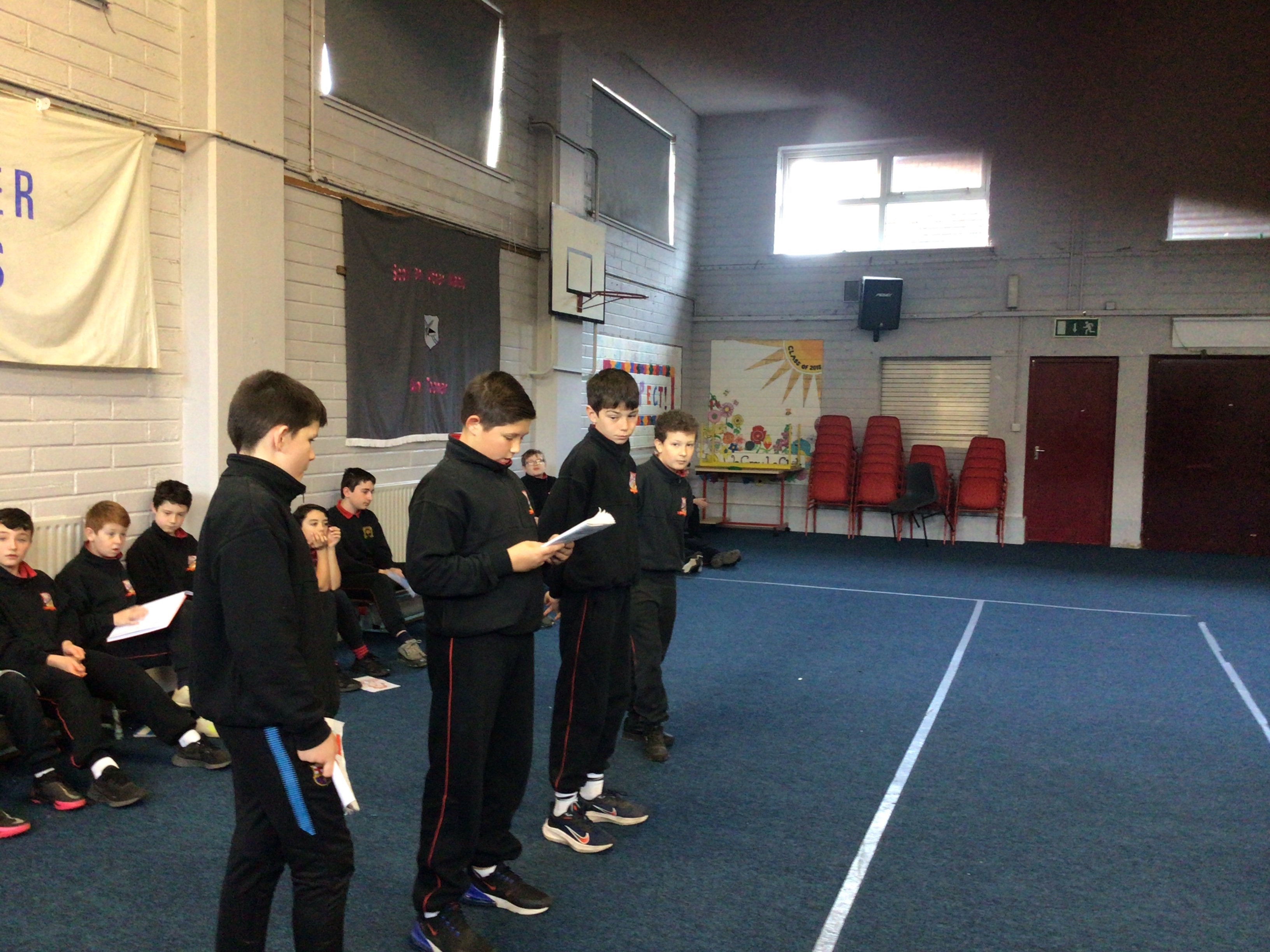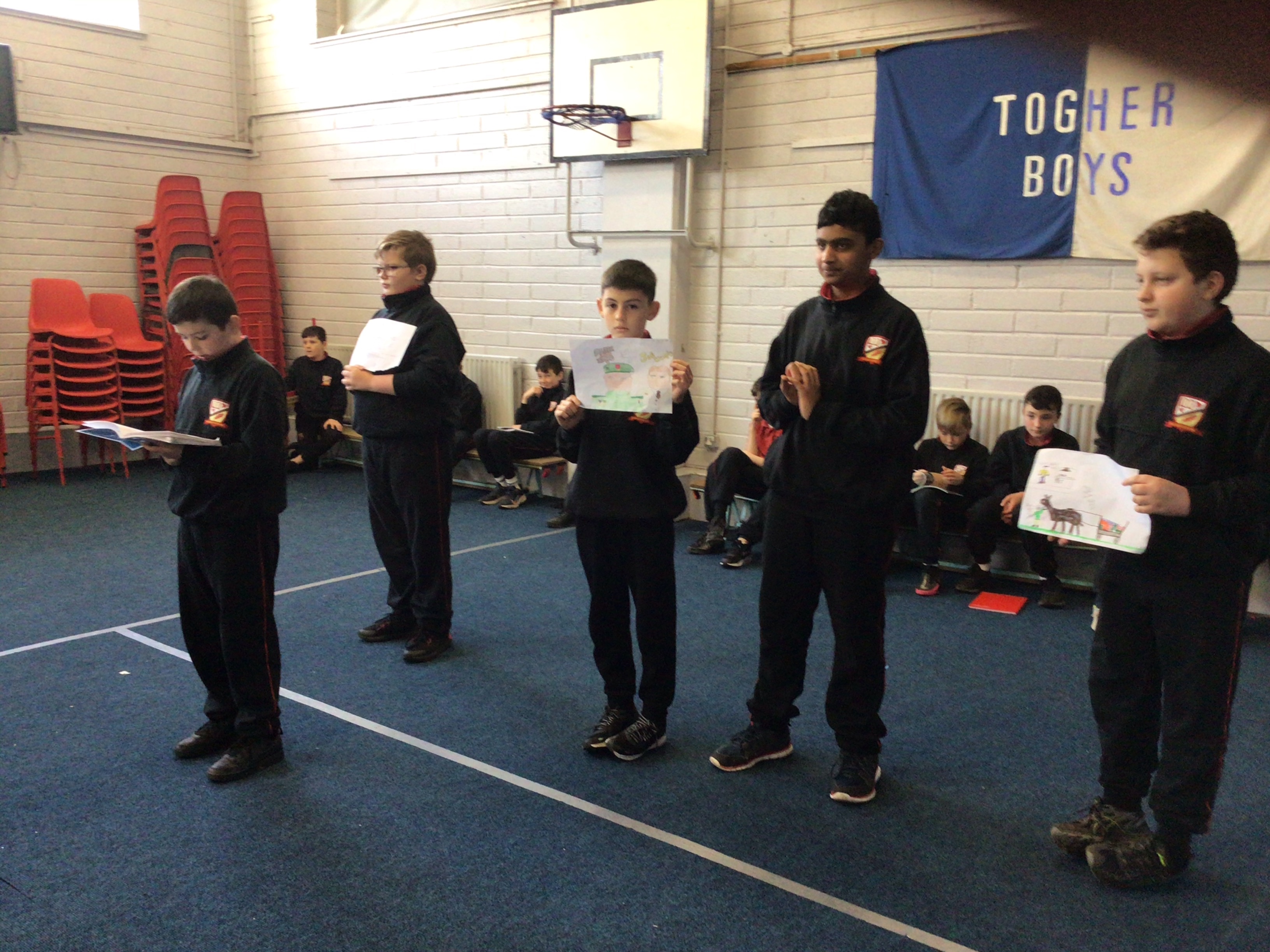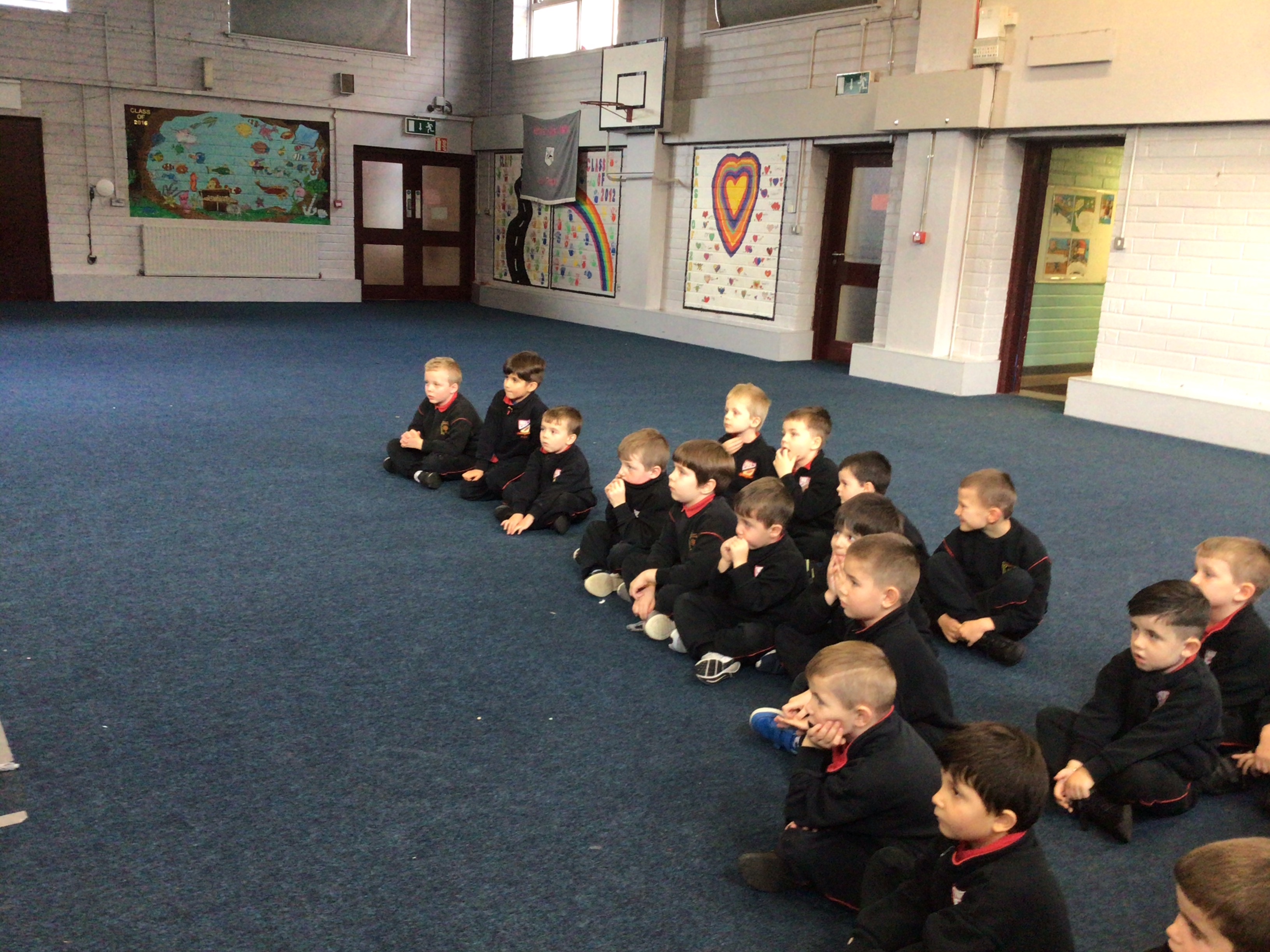 We gathered in the hall and told our stories to the infants.Every group got a chance to tell their story and the younger boys were enthralled.They enjoyed all our stories and loved looking at the lovely illustrations the sixth class had done.