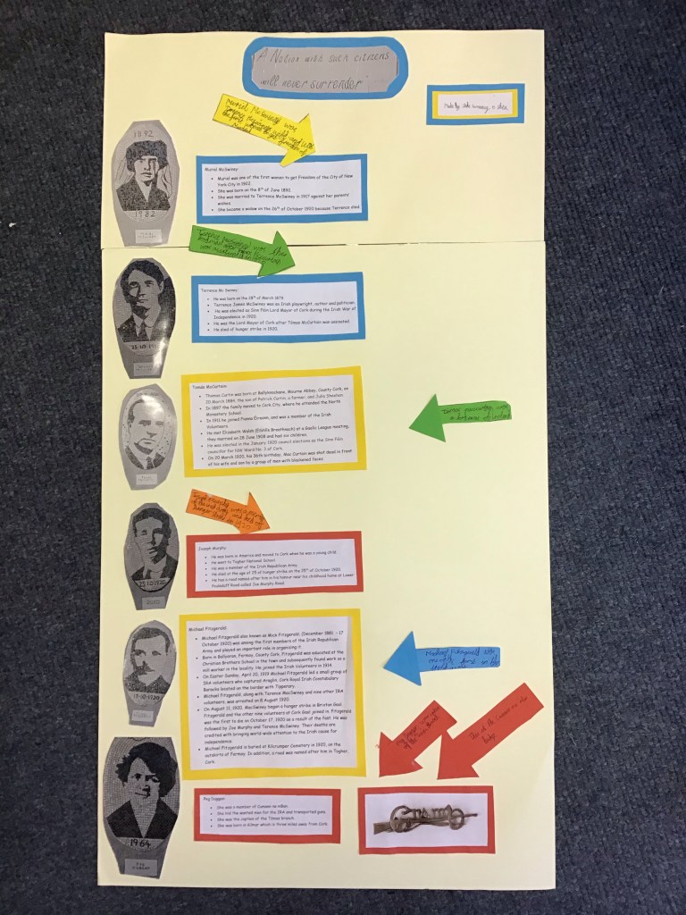 Since September Jake has been working extremely hard exploring the lives of people from Cork that were involved in the War of Independence. He has chosen six people from Cork to learn more about their lives and the impact they had on Irish history. He gained so much more knowledge from completing this project. The people he chose were: Peg Duggan, Muriel McSwiney, Terrence McSwiney, Michael Fitzgerald, Joseph Murphy and Tomás MacCurtain.
