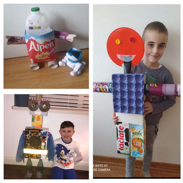 When learning about recycling the boys collected recycled materials from around their homes and used them to make robots.