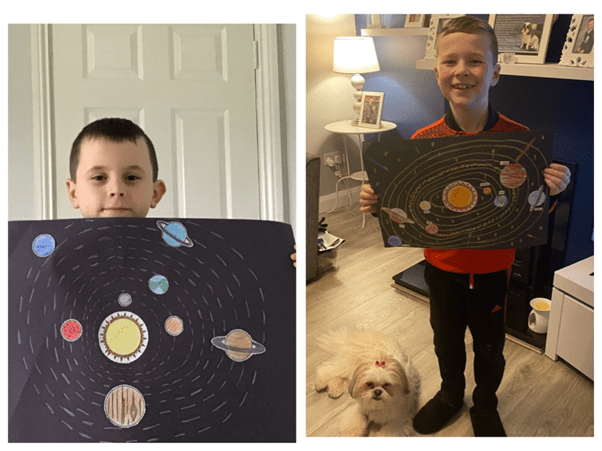 During Distance Learning the boys of second class were very creative while learning about various topics. They enjoyed making art work showing our Solar System. They also used 2d shapes in the primary colours red, yellow and blue to make rockets.