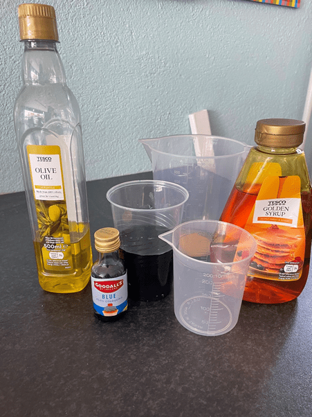 We poured 50mls of the golden syrup into a container. Next, we poured 50mls of water coloured with blue food colouring into the container. Lastly, we poured 50mls of cooking oil into the container.
