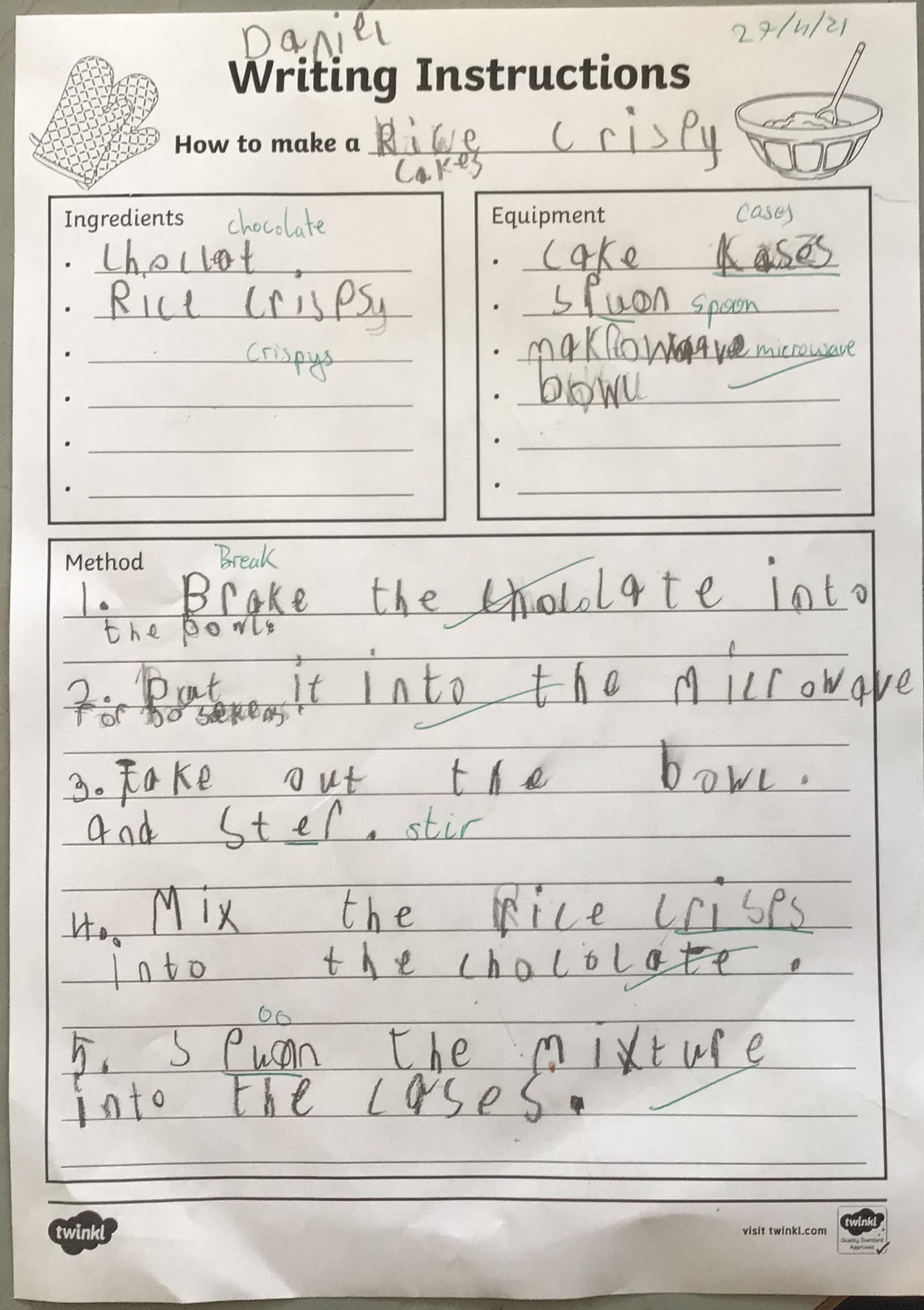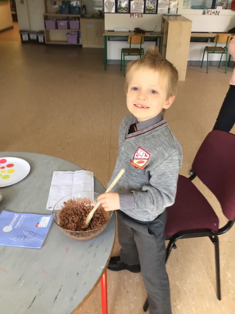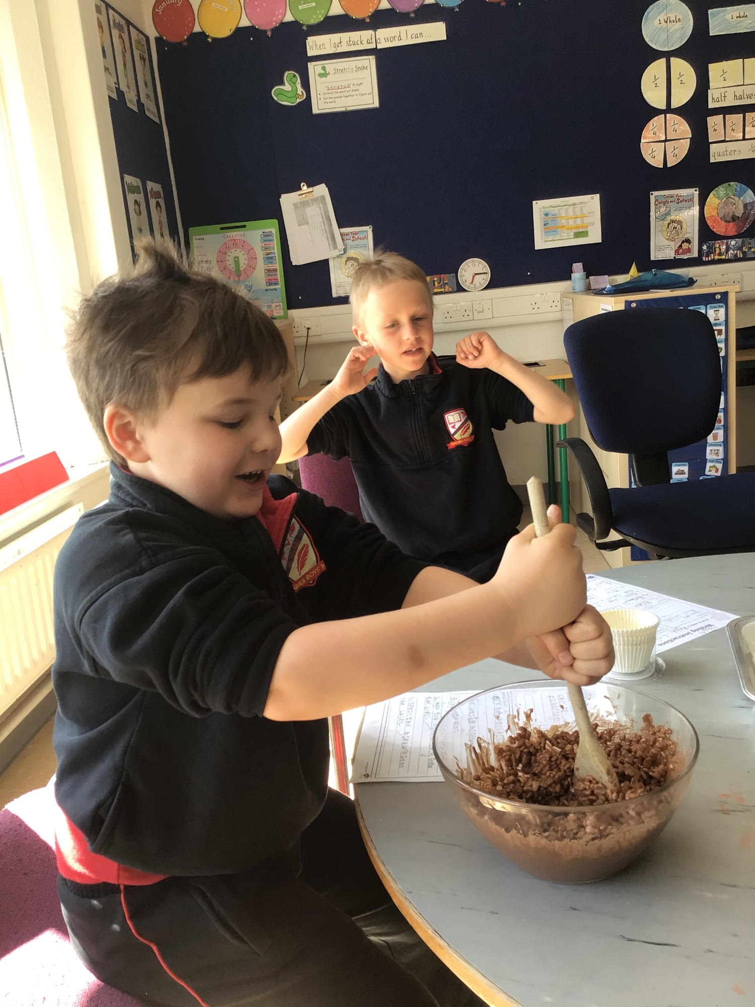 The boys in Coiscéim have been practicing writing instructions. This week we wrote our own recipes for Rice Crispy cakes! Today we tried out our recipes and made some cakes of our own!