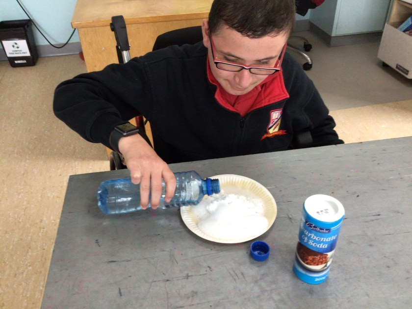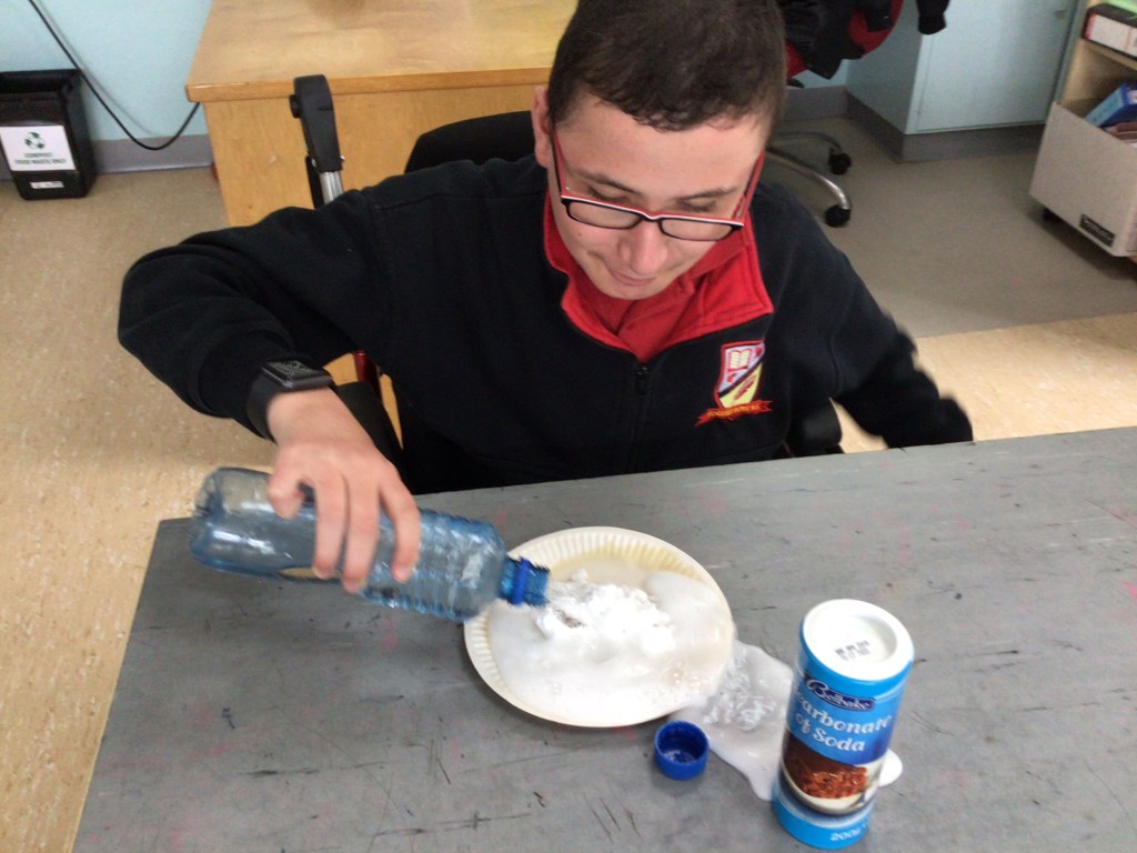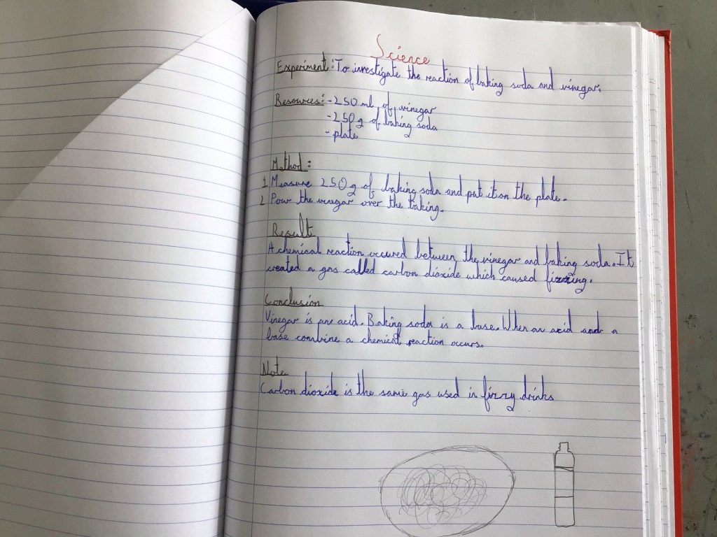 Fifth class have been looking at various acids and bases in our environment.We decided to conduct a science experiment using vinegar (an acid)and baking soda (a base). We discovered that a chemical reaction occurred between the vinegar and the baking soda when mixed together.