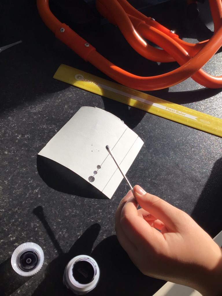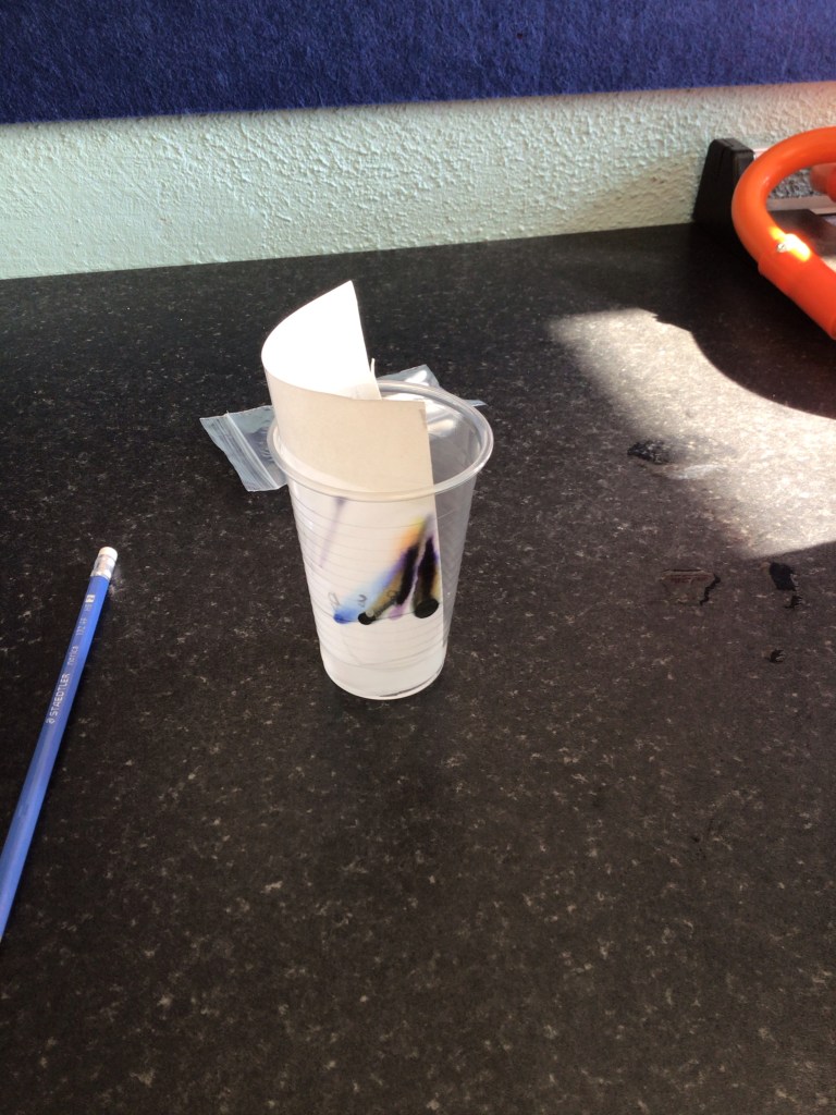 This week we learned about the laboratory technique of chromatography. This is where the different components(parts) of a mixture can be separated out. We looked at different inks which all looked the same but had been made with different colour dyes. We were able to separate the inks out using chromatography. Capillary action in the chromatography paper showed the true colours of each the inks. Measuring the distances from the base of the chromatography paper and calculating the volume of water needed to fill the beaker to the bottom line were important mathematical skills involved in our experiment. We learned that chromatography is often used in the pharmaceutical industry to check the purity of medicines.
