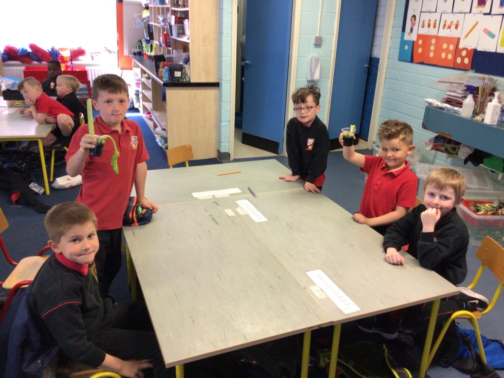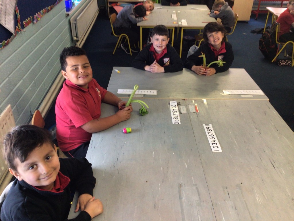 To help us understand how this process worked, we cut the ends off pieces of celery and placed them in jars of water with food colouring in them!
