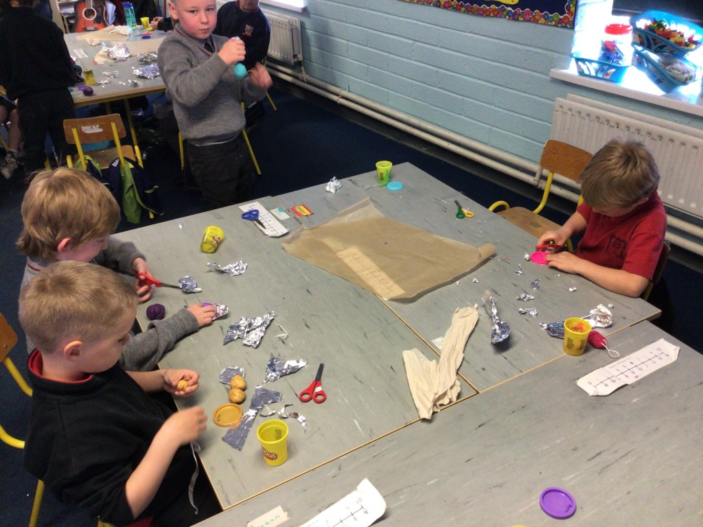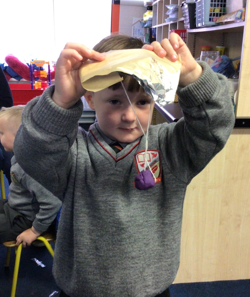 The boys were given a variety of materials to create the parachutes. We tested cling film, paper, tissues, greaseproof paper, and tinfoil. Paper and tinfoil were the winners as they slowed the descent of the playdough to 3-4 seconds.