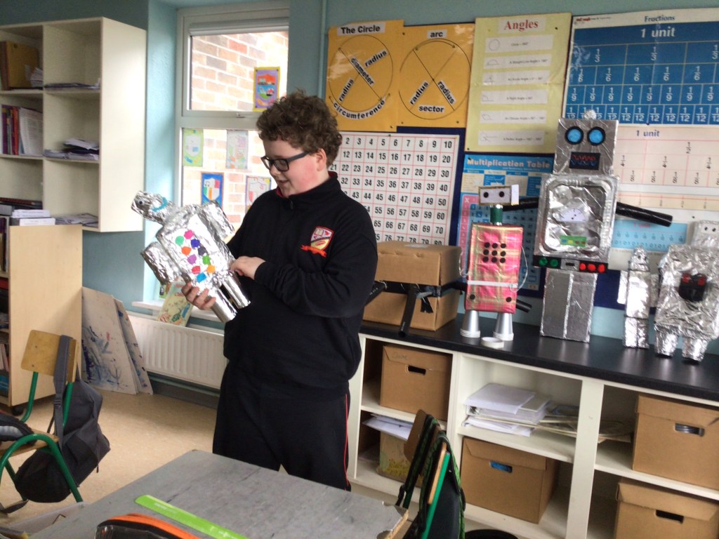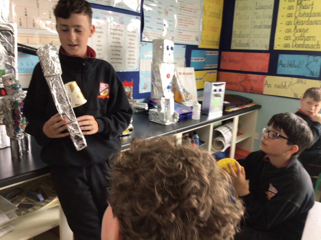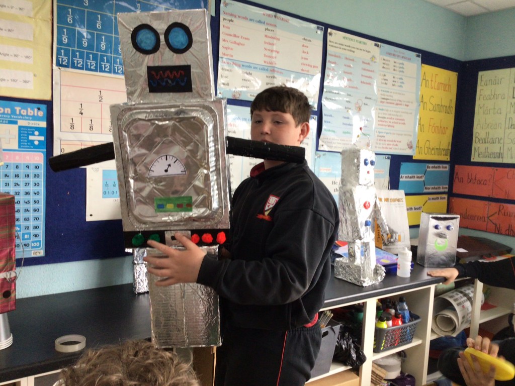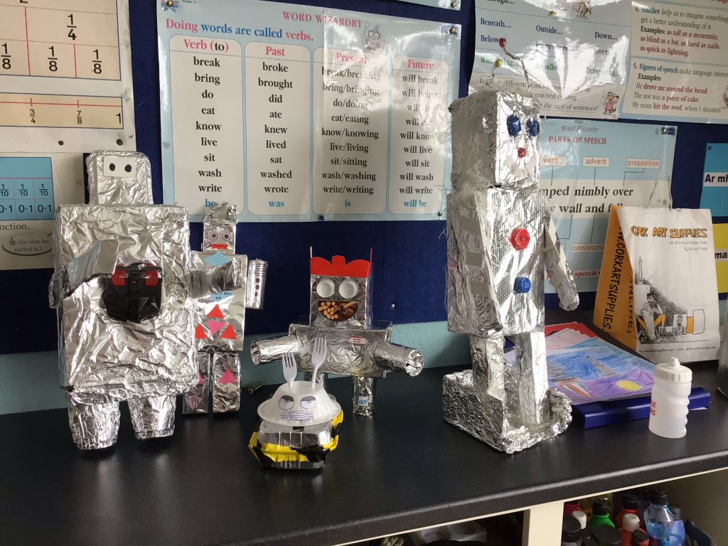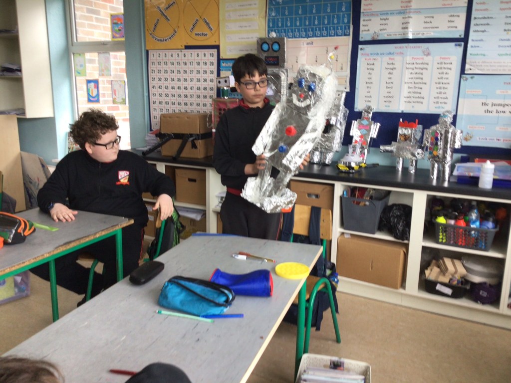 5th Class have been discussing the importance of reducing,reusing and recycling.We decided to design and create robots using recycled materials found around the house. Here are our creations!
