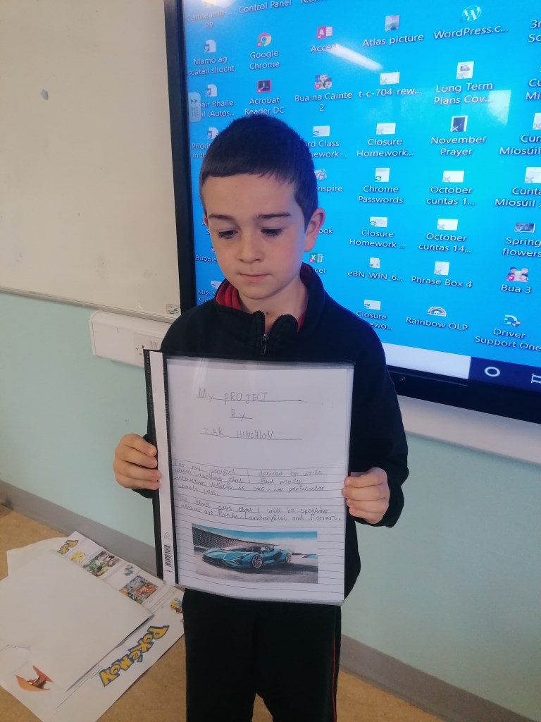 Back in May, I asked the boys to choose a topic of their choice for a project. I gave the boys a month to complete their projects. We discussed the importance of being able to present their projects to their classmates. The boys worked really hard on their presentation skills this month, prior to the project deadline. To say that I am proud of the boys is an understatement. I was blown away by what they produced. We had everything from Power Points about nuclear plants, Chernobyl and penguins to cars, exploding volcano models, famous football players, Mexican gods, the list was endless. Over two days, each boy presented their project and gave us an insight into their chosen topic. What amazing work you did boys. Your teacher could not be prouder of you. Well done.