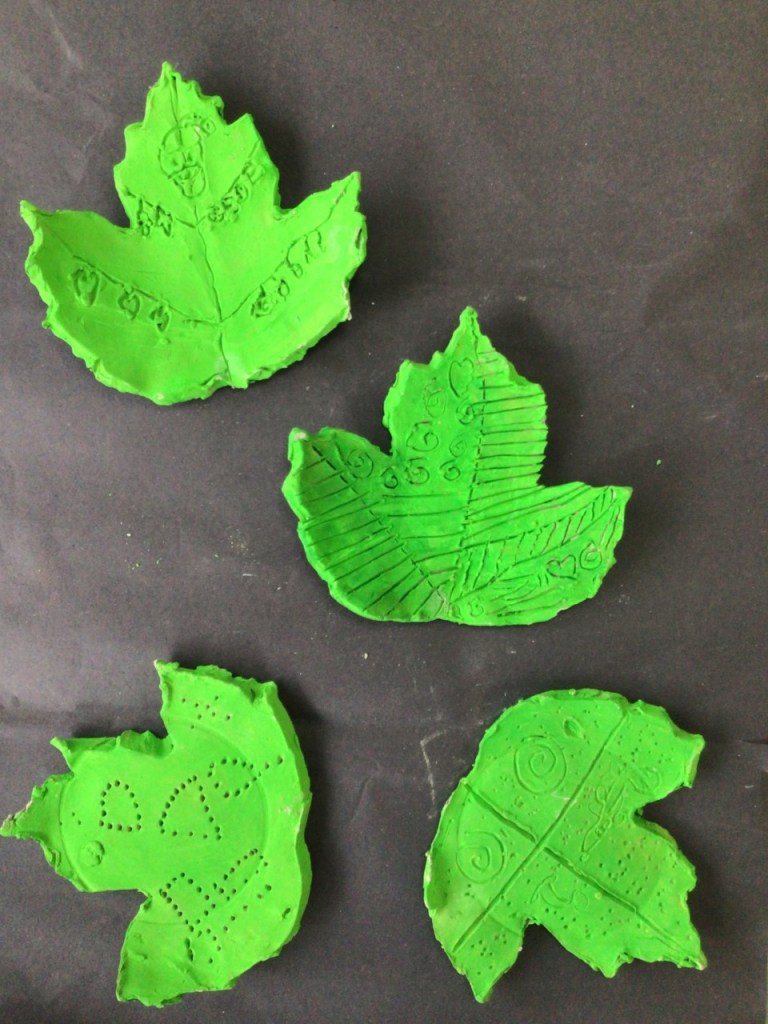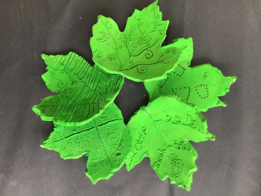 In art we made some ‘sycamore leaf’ plates using clay. First we used rolling pins to flatten the clay. Next we cut out the shape of our leaves. Then we added our own designs. When the clay dried we painted the leaves!