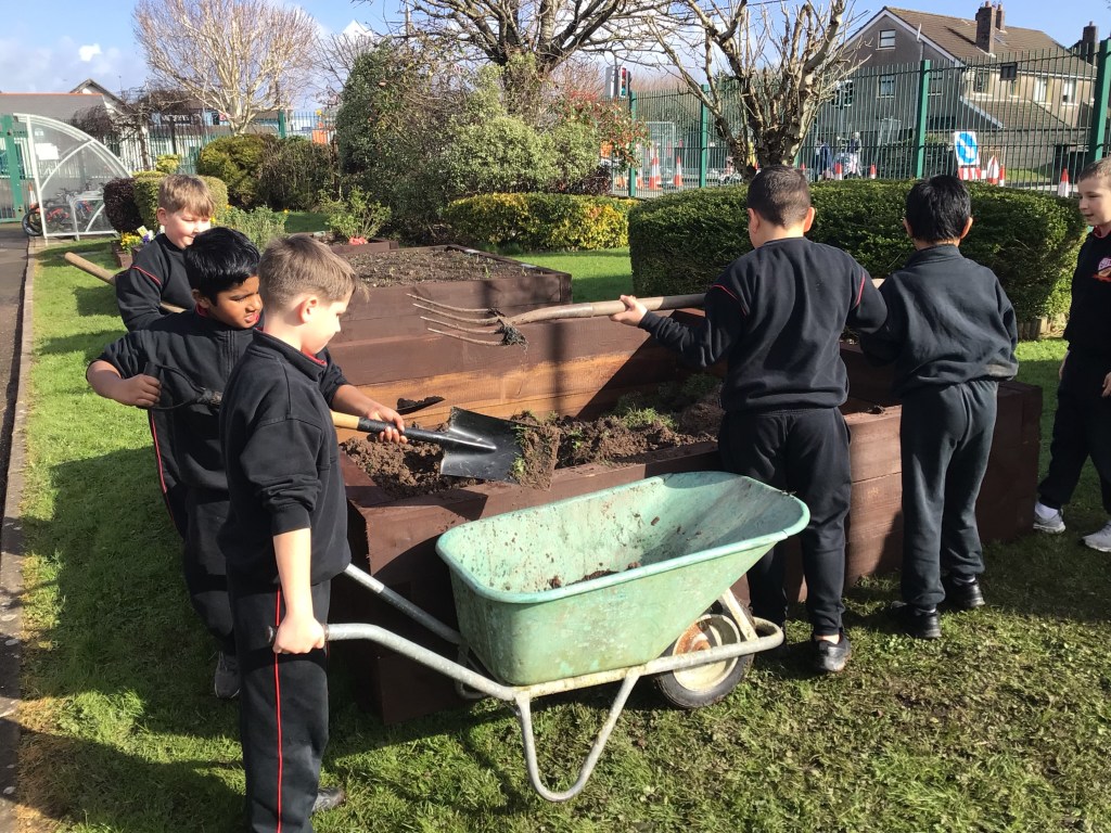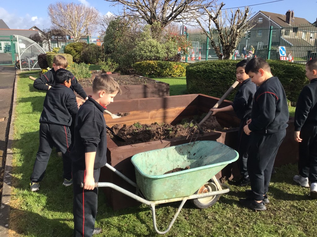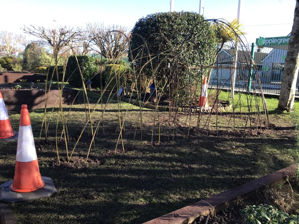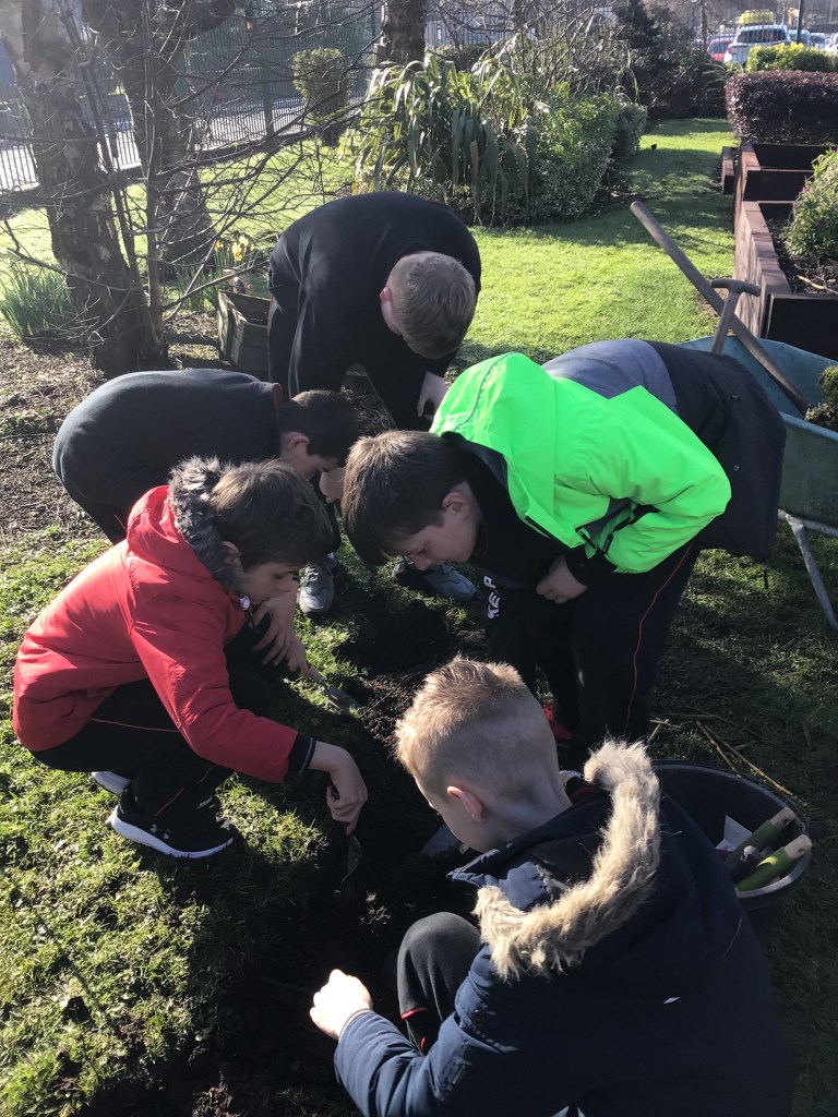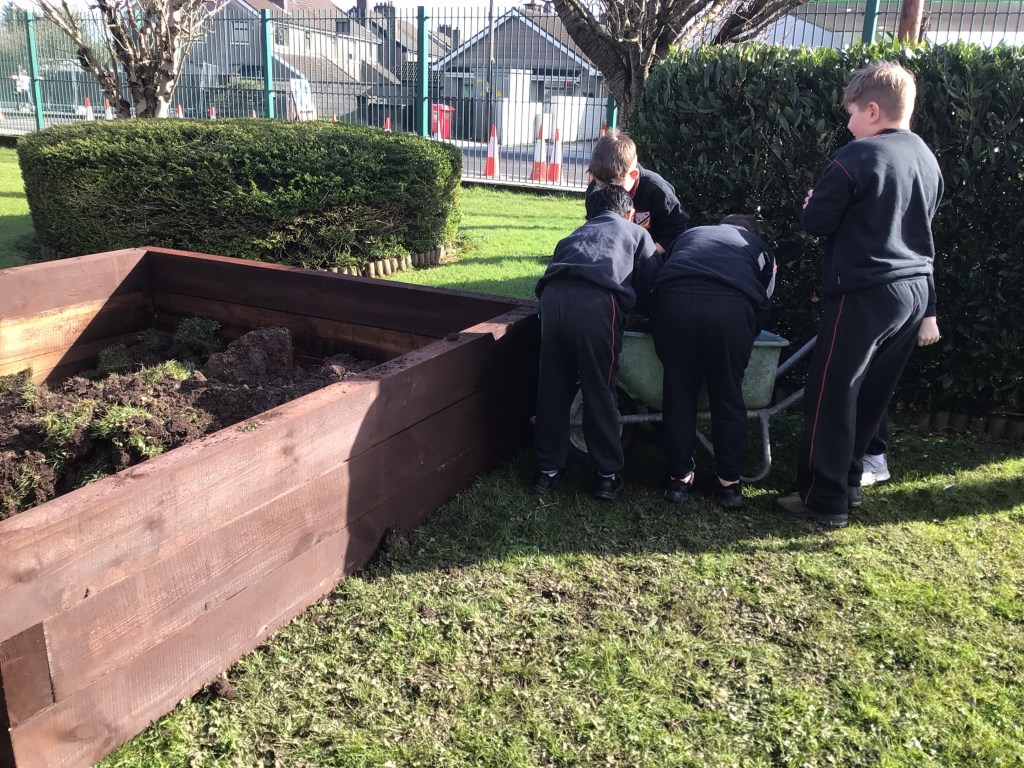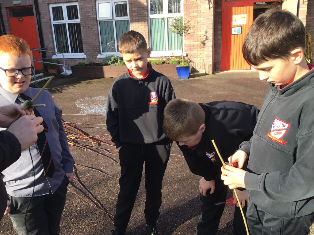 On Thursday 3rd March, both fourth classes got their gardening tools out and their hands dirty. The boys worked in groups to, sort, weave and plant the willow. Each group got an opportunity to perform different tasks, working hard to dig out a suitable plot in the garden and construct the willow dome and tunnel. Both 4th classes have contributed a lot to the school garden this year and were delighted to see the impressive dome and tunnel take shape after all their hard work.