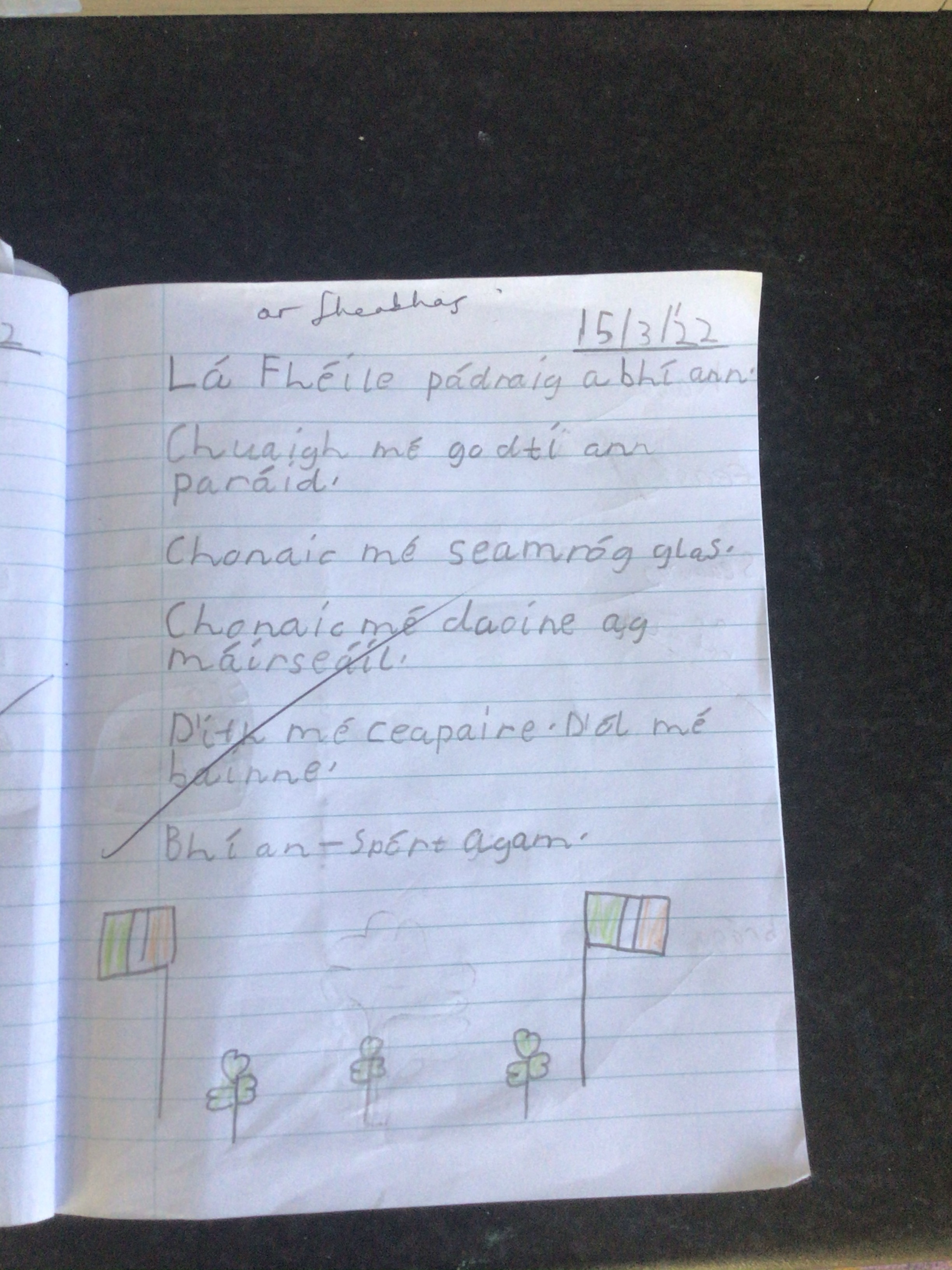 The boys had a great week this week learning all about St. Patrick. As it was also Seachtain na Gaeilge the boys wrote and recited some sentences as Gaeilge. The highlight of the week was most definitely dancing The Siege of Ennis. Well done boys. Your teacher is so proud of you as always. Beannachtai na Feile Padraig.