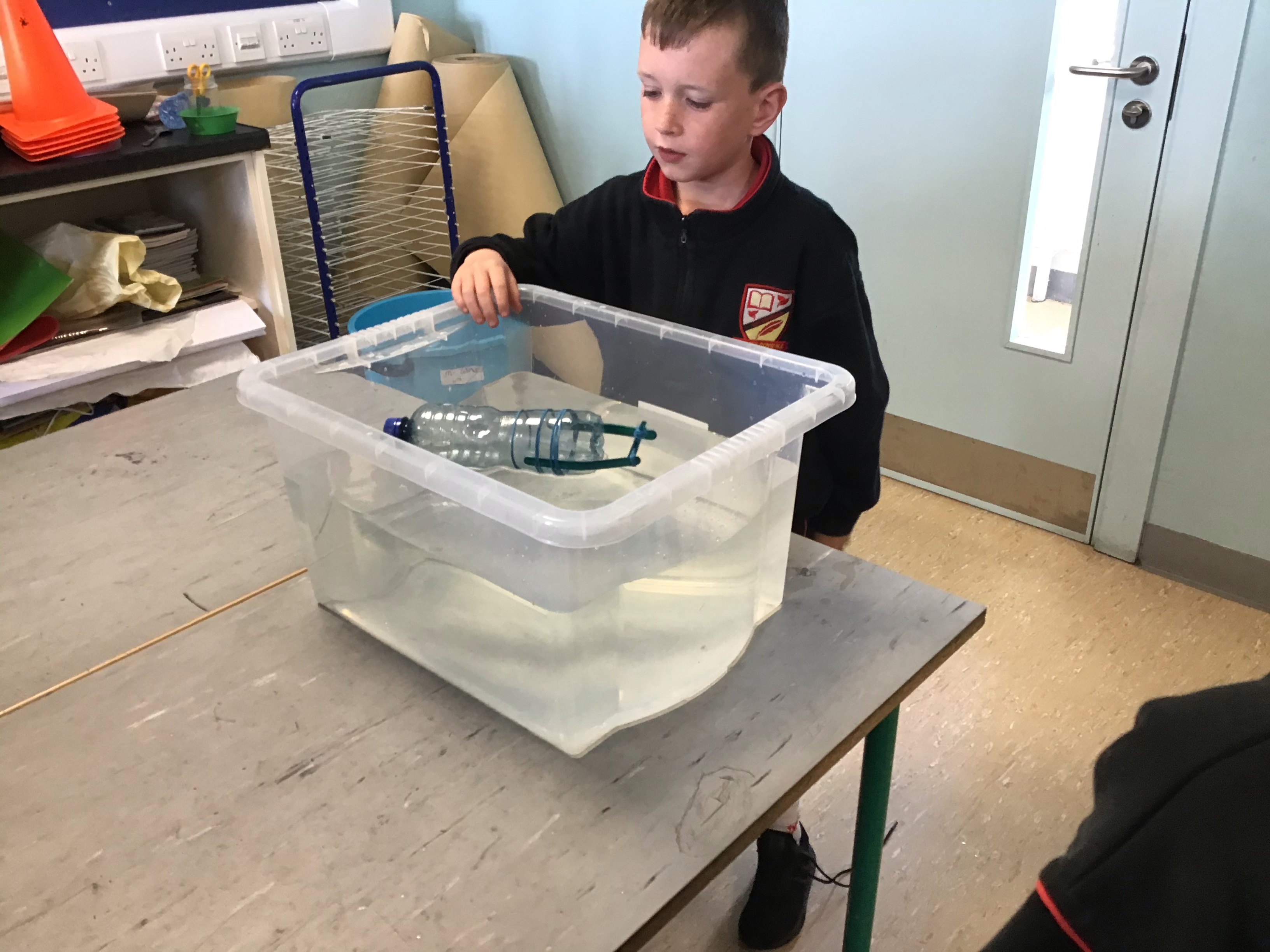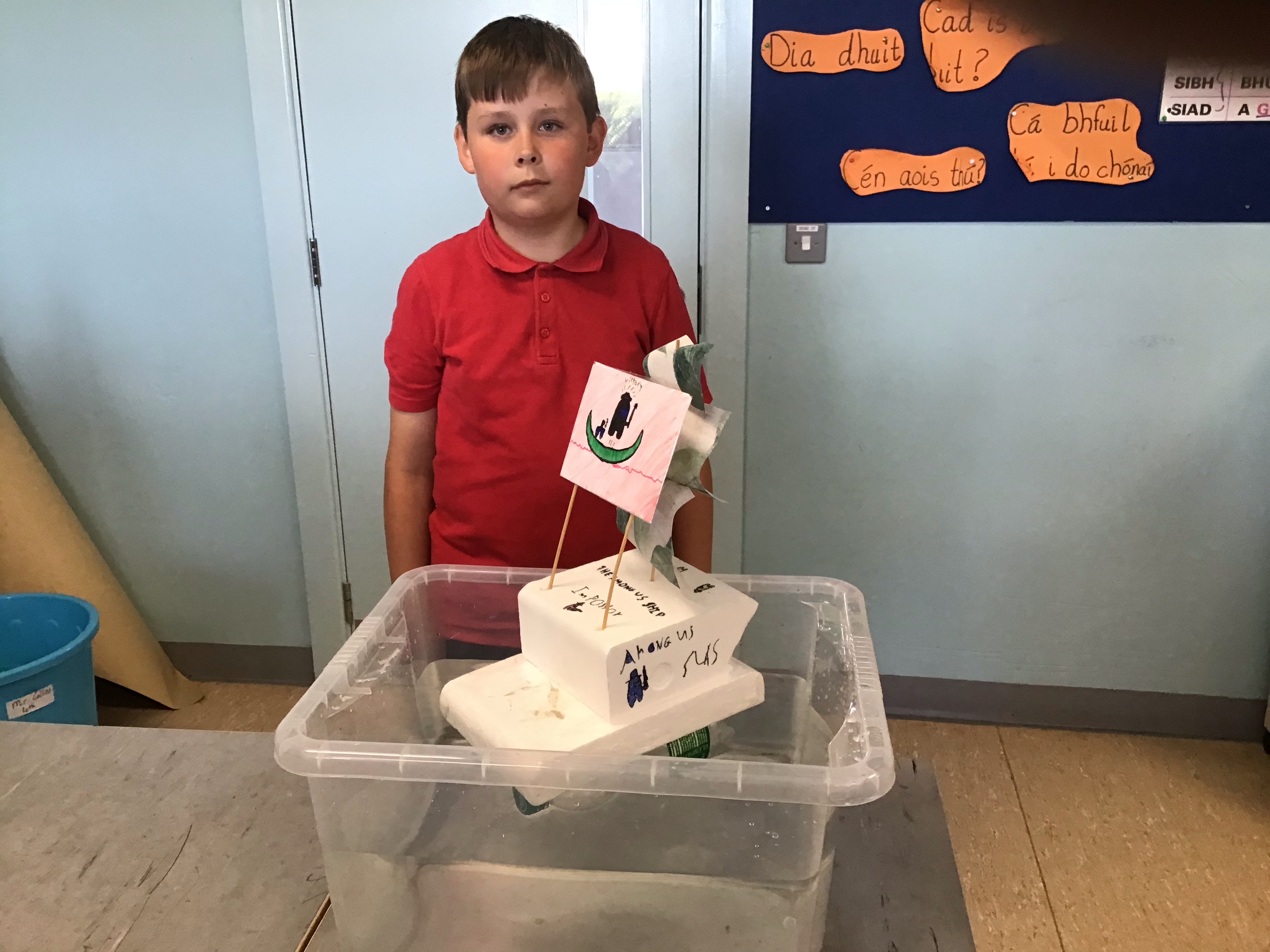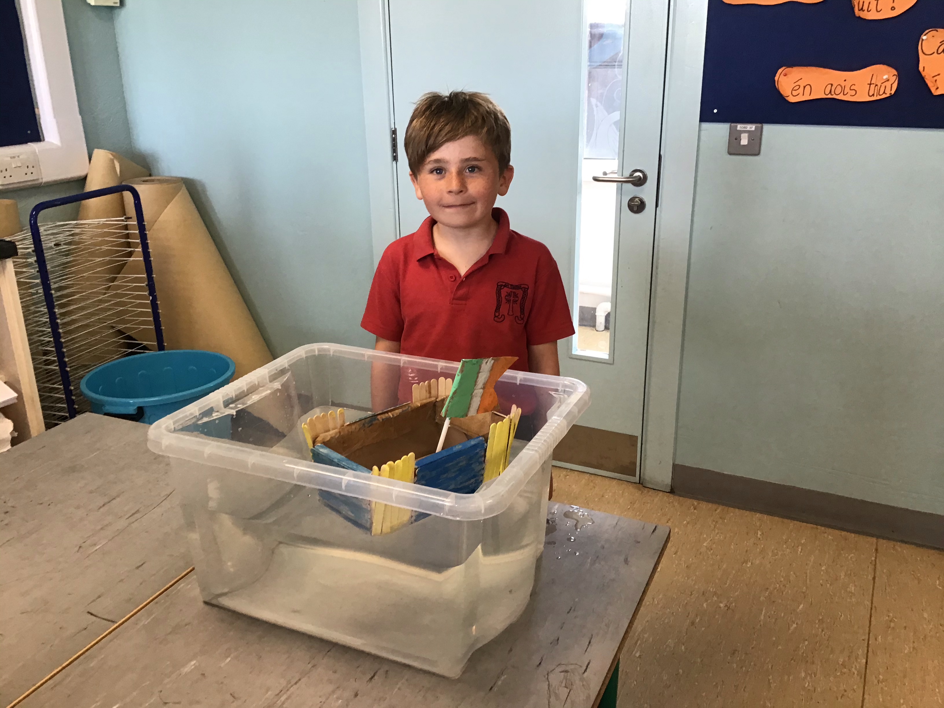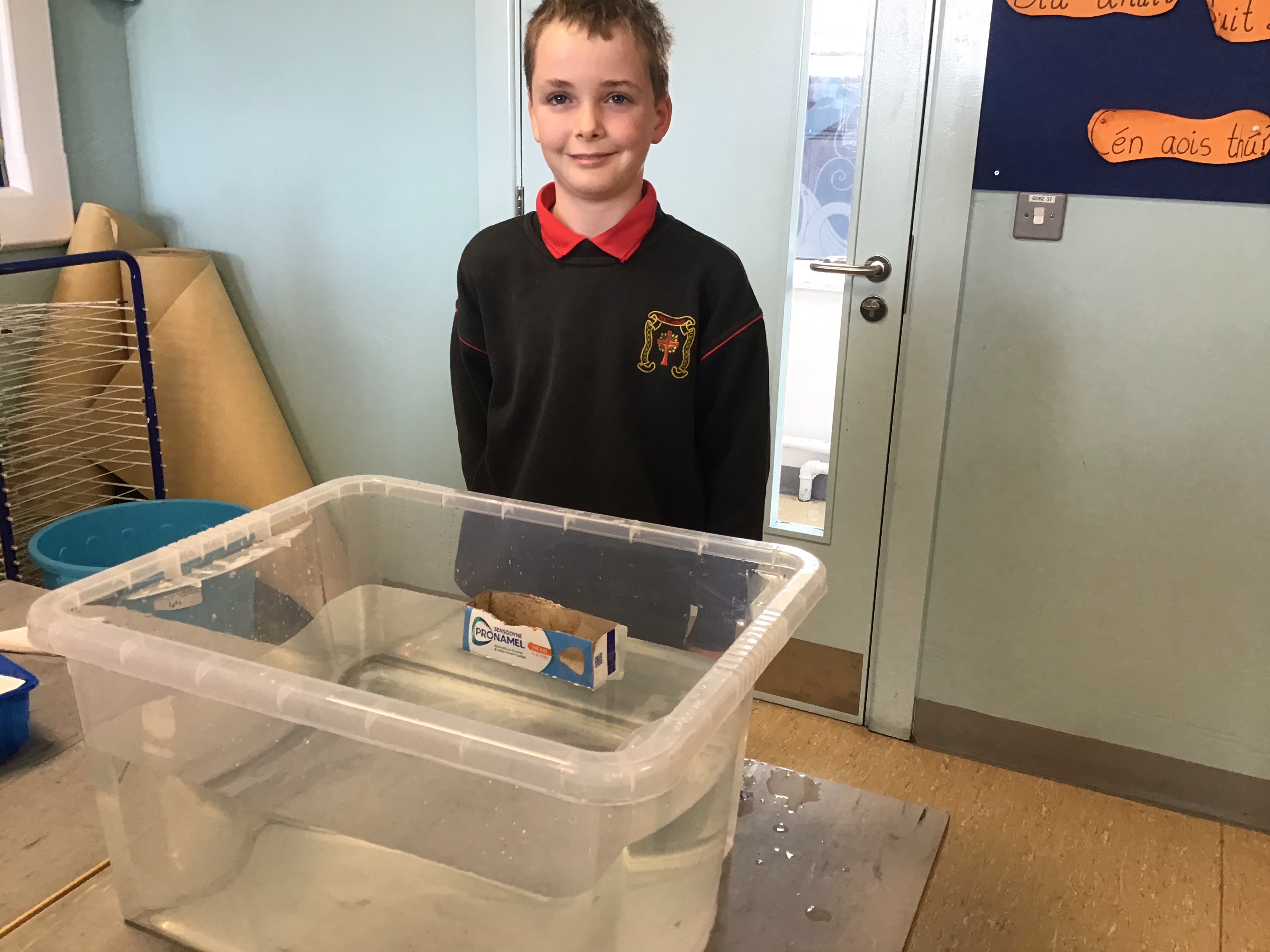 3rd class have been studying buoyancy recently and have been busy investigating why things float or sink. We discovered that for a boat to float it must have a lower density than the water. Density depends on two things; mass and volume. Mass is the amount of stuff that is in an object while volume is the amount of space it takes up. We also agreed that for something to float successfully in water it would need to be waterproof. We conducted two experiments; one to investigate what objects float and sink in water and the other to test what materials were waterproof.