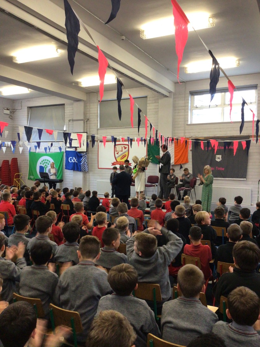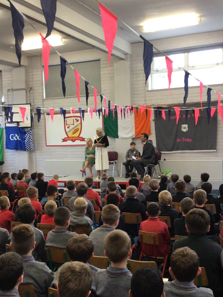 After a two year absence, we were finally able to welcome back the Lord Mayor of Cork, Deirdre Forde, to Togher Boys NS. The boys were delighted to meet the Lord Mayor and loved learning about the history of the Chain of Office. Mason Gabriel was presented with a certificate of perfect attendance in school by the Lord Mayor. Well done to Mason! The boys performed a lovely rendition of Báidín Fheilimí and the Lord Mayor suggested that they get homework off for their efforts. The boys were delighted with this suggestion and are already looking forward to next year’s visit.