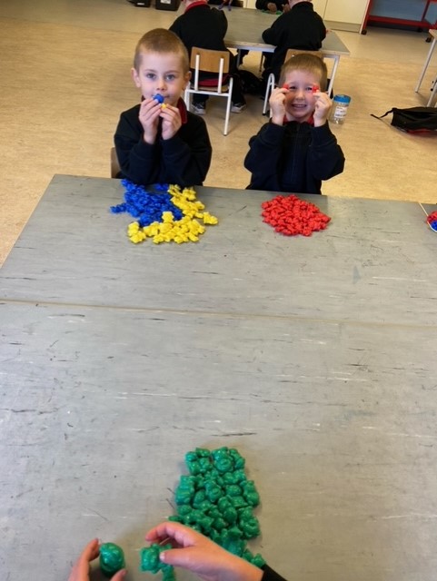 The boys love playing math games and sorting items into colours.