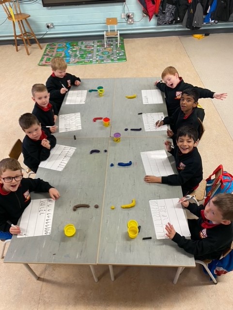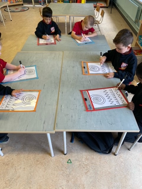 The boys in Ms. Collins’ class have been very busy getting to grips with writing! They love using playdough, tracing, drawing and forming new lines, marks and even letters!