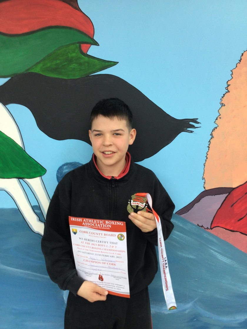 Well done to Jonathan Brothers who recently became a county champion in boxing. Jonathan was competing in the 40 kg category and has been training hard with Togher boxing club for the last 4 years. Well done Jonathan!