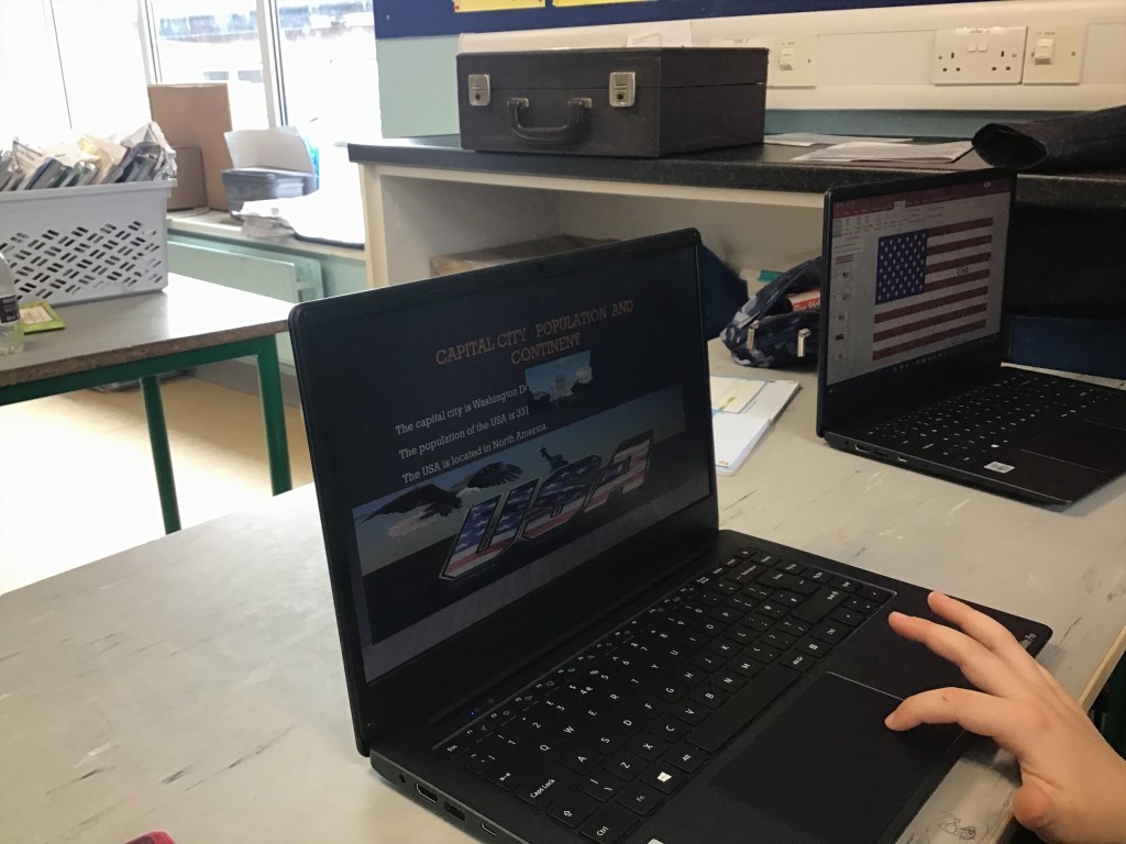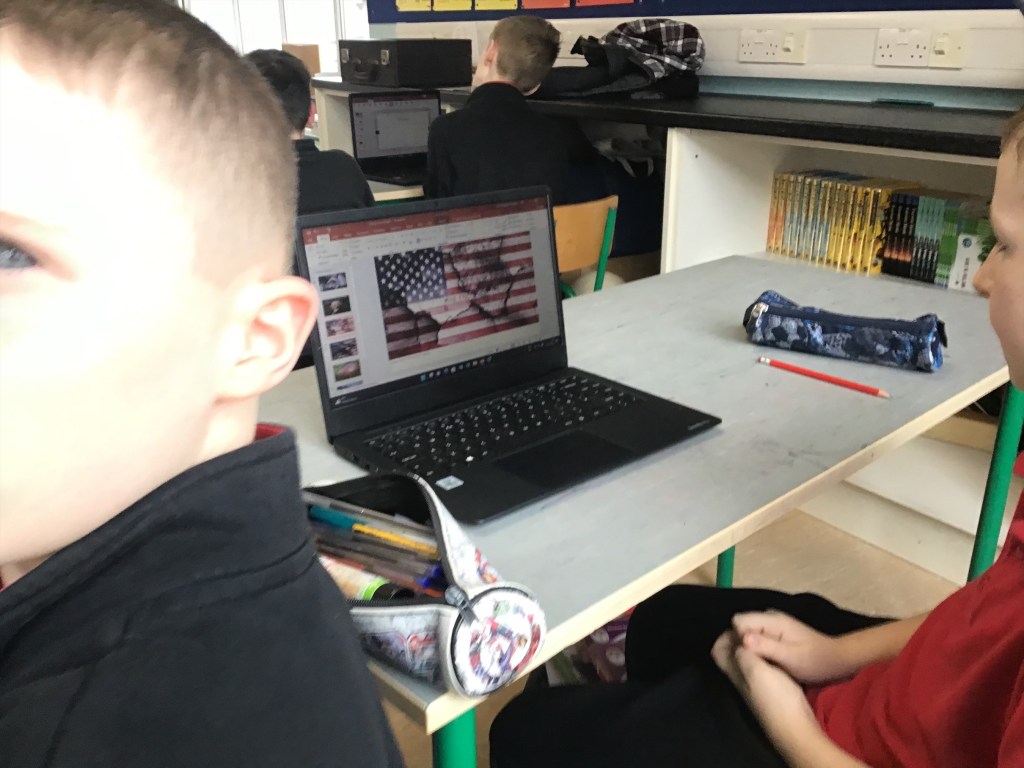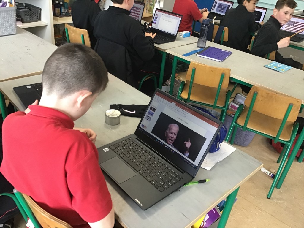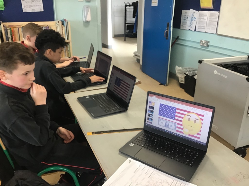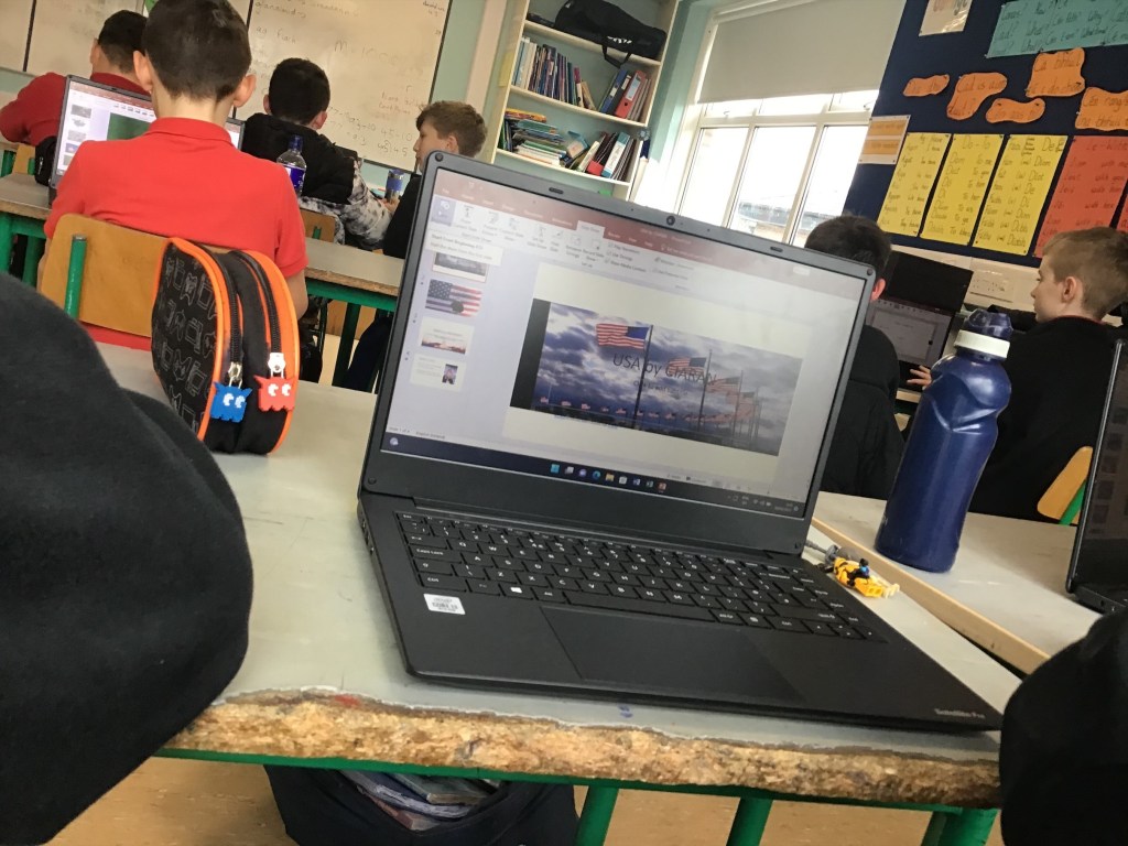 5th class have being making full use of the new laptop trolley in school recently. We merged our computer and geography skills to prepare projects on the USA. We wanted to study this country after learning about it’s fascinating revolution and war of independence in the 18th Century. We first used the internet to research our topic and then began to prepare our PowerPoints