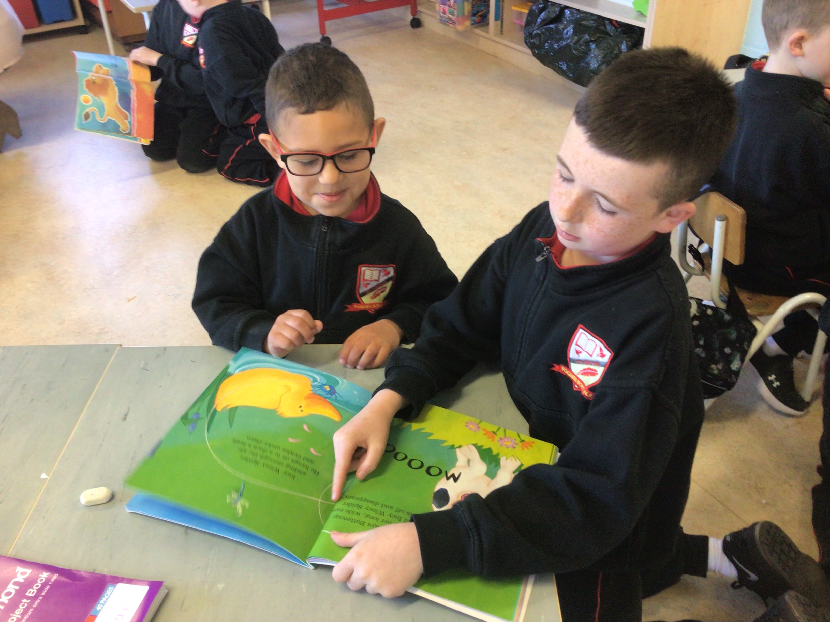 Ms O’Dwyer’s class have been very lucky to be working with the 3rd Class boys in Mr Ryan’s class for the last few weeks. Mr Ryan’s class read some lovely books to the Junior Infant boys which they really enjoyed and it was lovely to see the boys working together! The older boys are great examples for the boys and we hope they can continue to practise their reading in order to improve!