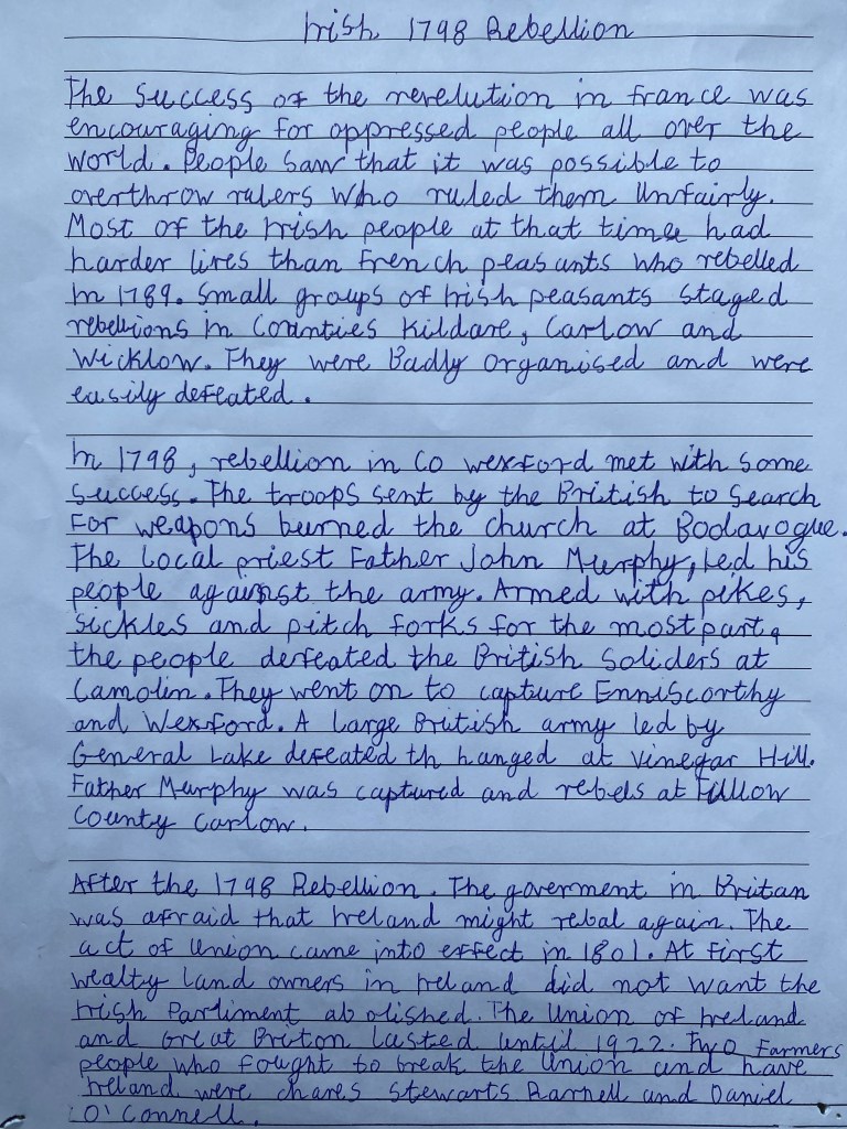 The final piece of Wow Work put on display outside Mr Collins class comes from Filip Mordal. After studying about the age of revolutions in the 18th century, Filip produced a fantastic piece of writing about the 1798 Rebellion in Ireland and the subsequent act of Union