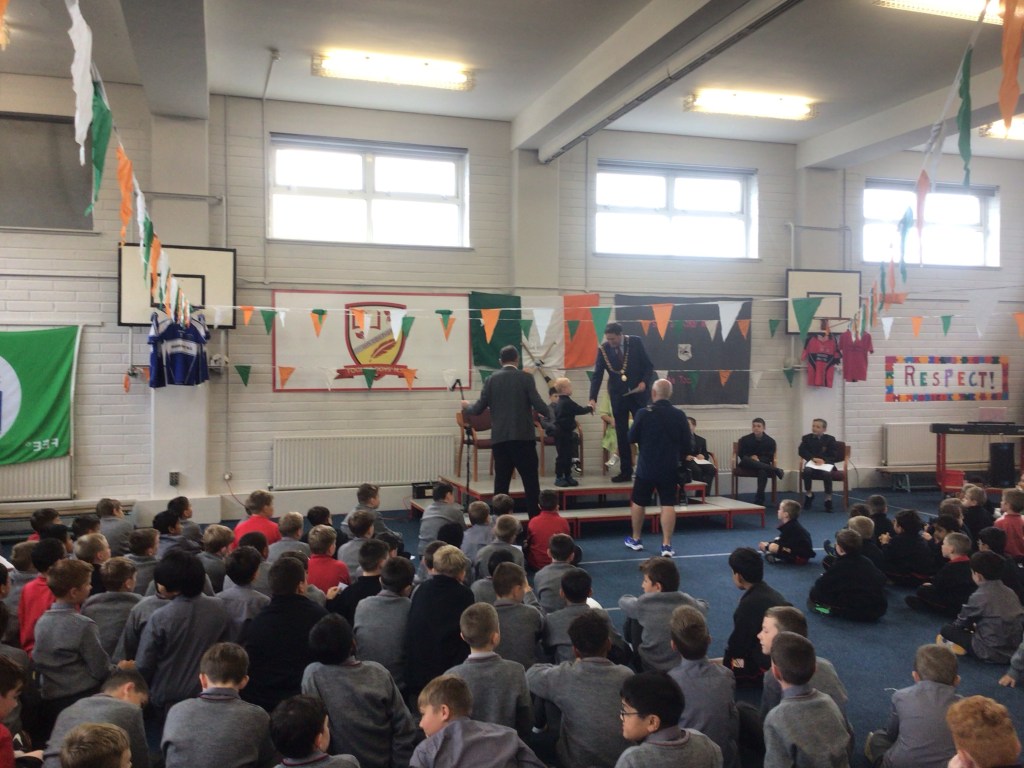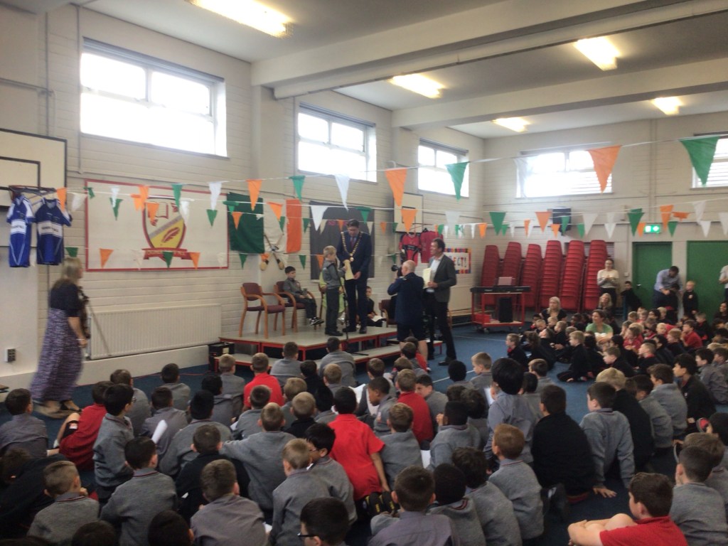 In the hall all pupils and staff gathered where the Lord Mayor received a very warm welcome and we sang Amhrán a bhFiann. Peter, Zak and Daniel provided words of welcome as Gaeilge agus as Béarla. Cllr. Mc Carthy is a wonderful story teller and we were all enthralled at his personal story which began with his very keen interest in History and particularly the History of Cork City when he was a pupil himself in primary school. He encouraged us all to explore our wonderful city and he was delighted to hear of all the trips taken by classes to places like the Cork City Gaol , Shandon and Elizabeth Fort just to mention a few.