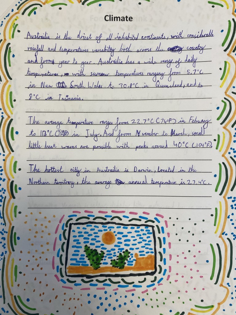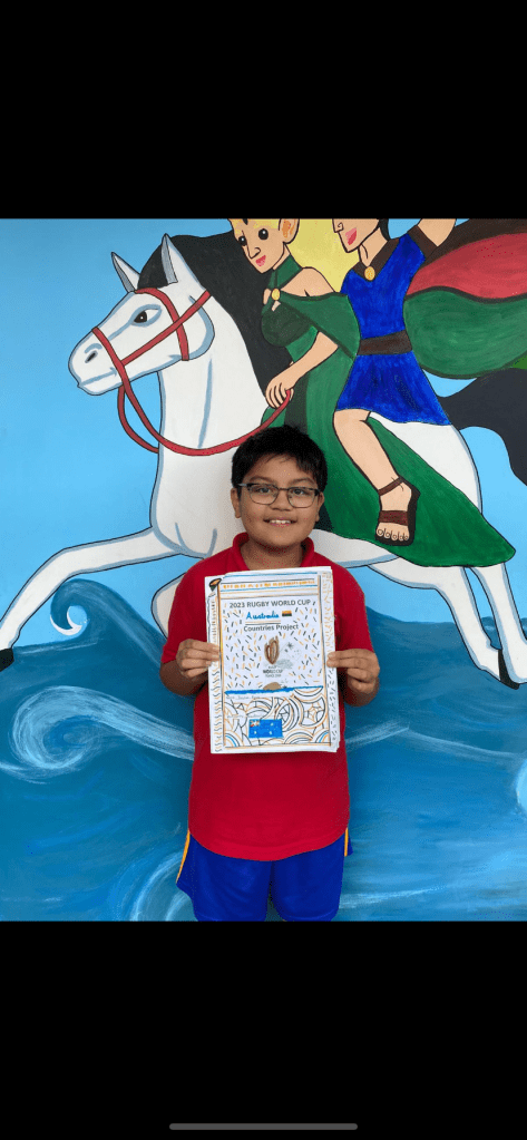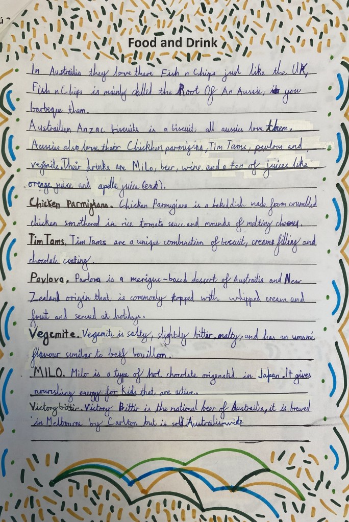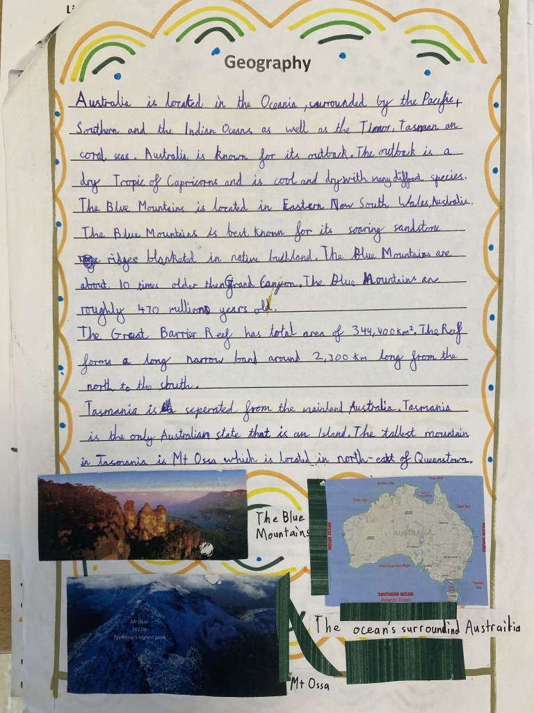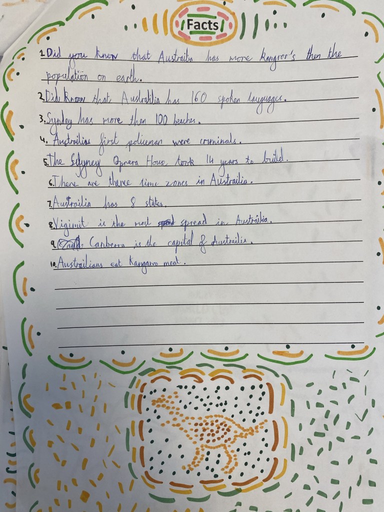 The first Wow Work on display in 5th class this year is Tristan’s wonderful project on Australia. This project was full of research and incredible information and was beautifully presented with wonderful handwriting, pictures and indigenous art.