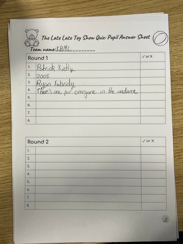 On Friday, Ms Walsh & Mr O’Shea’s 3rd class boys held a very enjoyable table quiz. This consisted of 9 teams with each team having 4 team members. The teams consisted of two boys from each class. This proved to be very successful with all the boys participating very enthusiastically. Each team demonstrated great teamwork and problem solving skills. Well done to all!