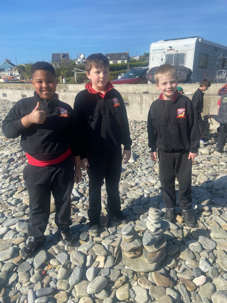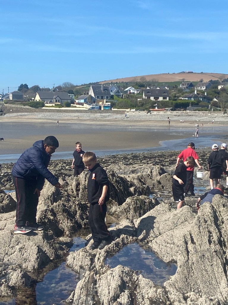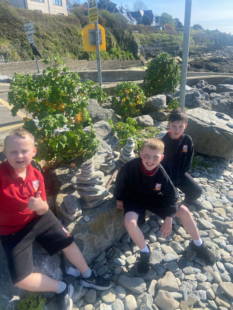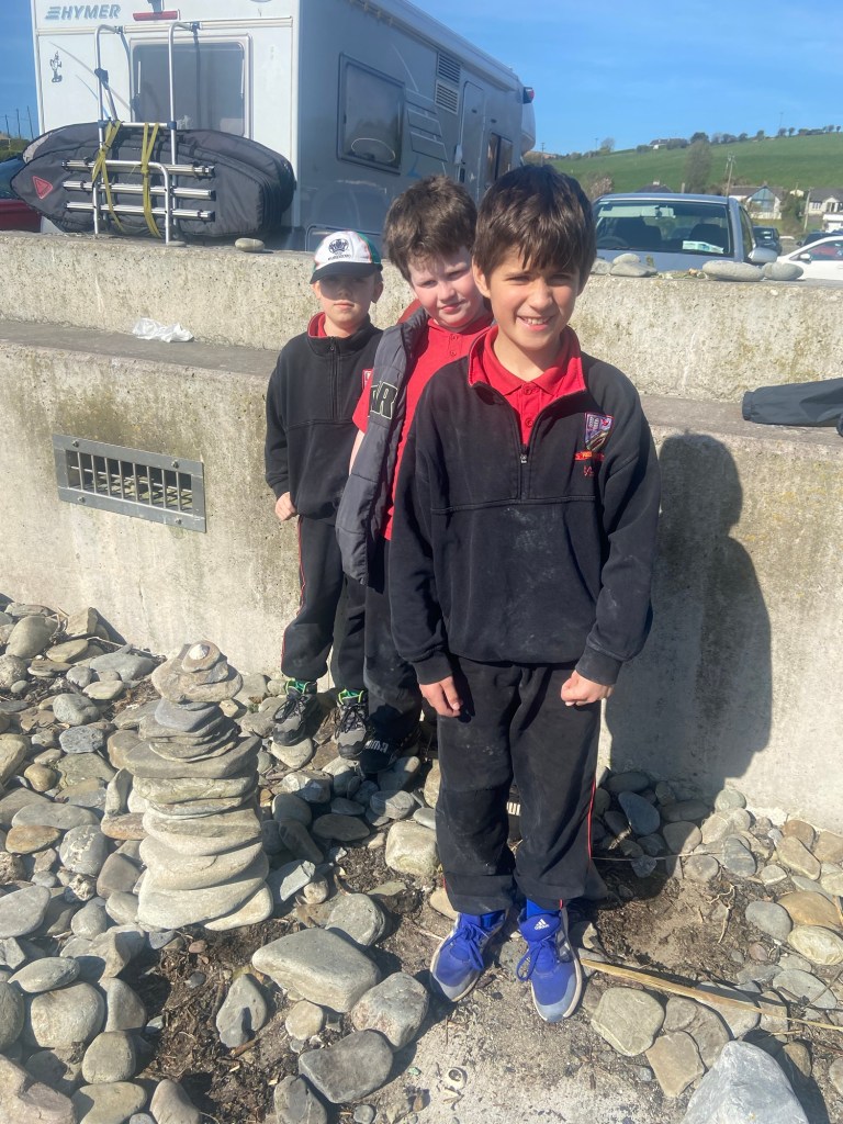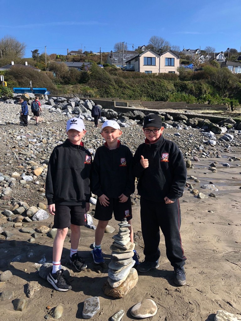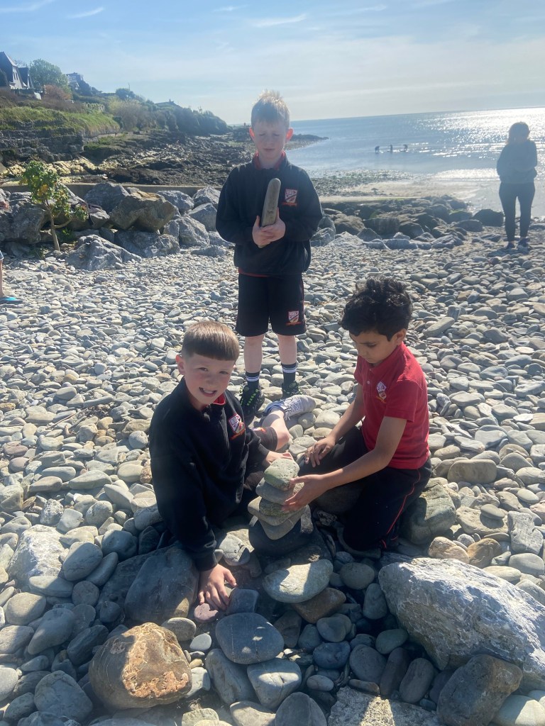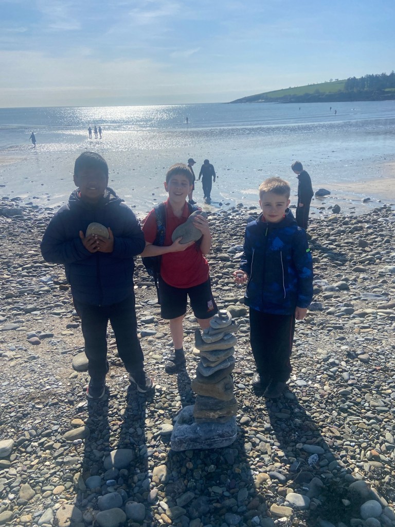 Yesterday both third classes went to Fountainstown. We had the best day investigating what creatures live in the rock pools there. We had great fun searching in the rock pools with our buckets and nets. We saw some amazing creatures like three different species of crabs, prawns, different small fish, sea snails, periwinkles, different types of seaweed and some anemones. We also made some rock cairns on the beach and had some fun looking for rocks of different shapes and sizes. The sunshine made the whole day even better. We were learning so much new information about the seashore that we never knew before which has made us more excited to visit the beach during the Summer holidays with our families to show them what we learned. The day was topped off with a picnic on the beach and a stop off in the playground in Carrigaline on the way home. We went home exhausted but had the best day ever!