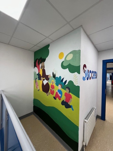 To celebrate our mission , beliefs and values the school commissioned local artist Kevin O’Brien to paint murals around the school. These help us to share our beliefs while also reminding us to try to live them every day. The school would like to thank Kevin O’Brien for the beatuiful art work, ACE Ireland for their guidance and thank Cork City Council for supporting our project through their Creative Communities Grant.