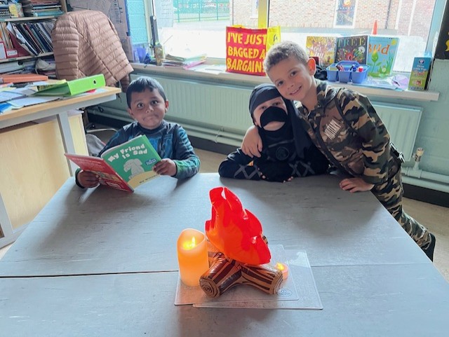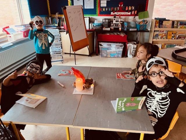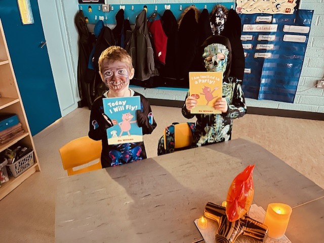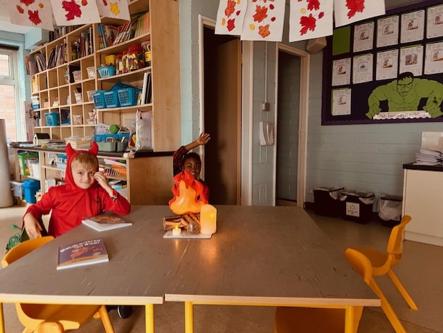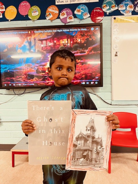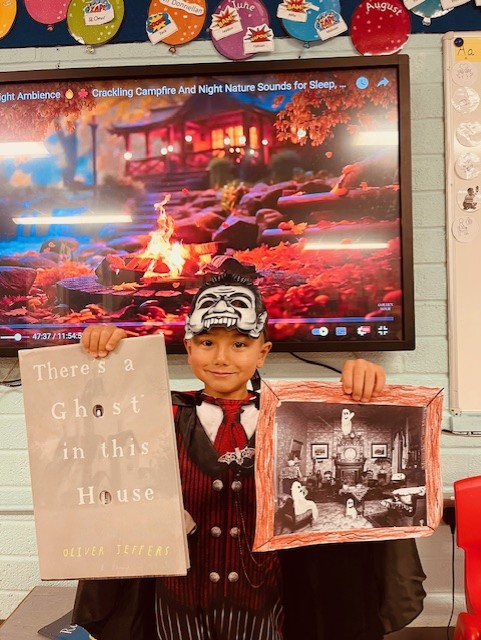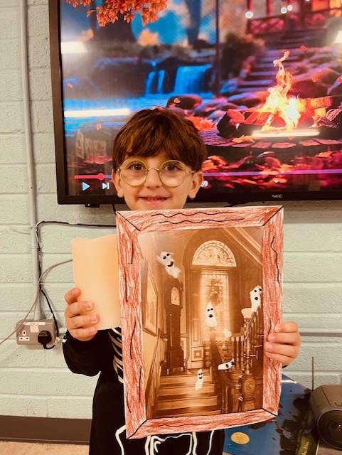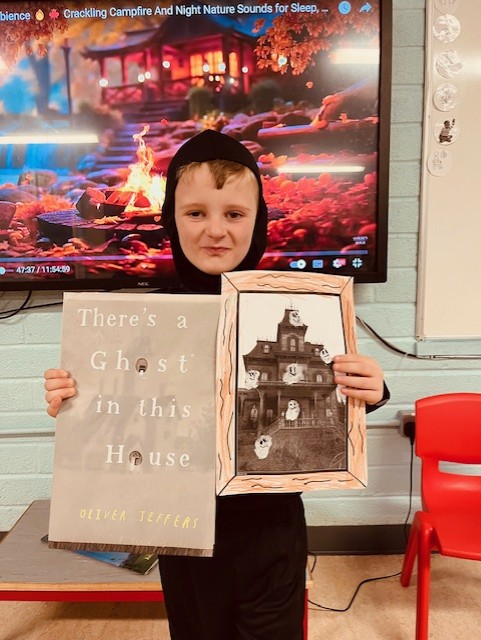 The boys in Senior Infants had a fun dress up day for Halloween today. They began with a surprise of a book from the school and they all settled down to read their books next to some campfires! We also read ‘There’s a Ghost in this House ‘ by Oliver Jeffers and the boys created their own art work based on the book! We finished the day with some treats and relaxed to watch a movie!