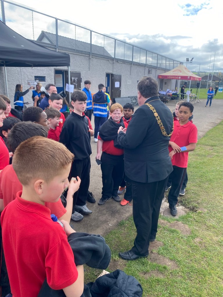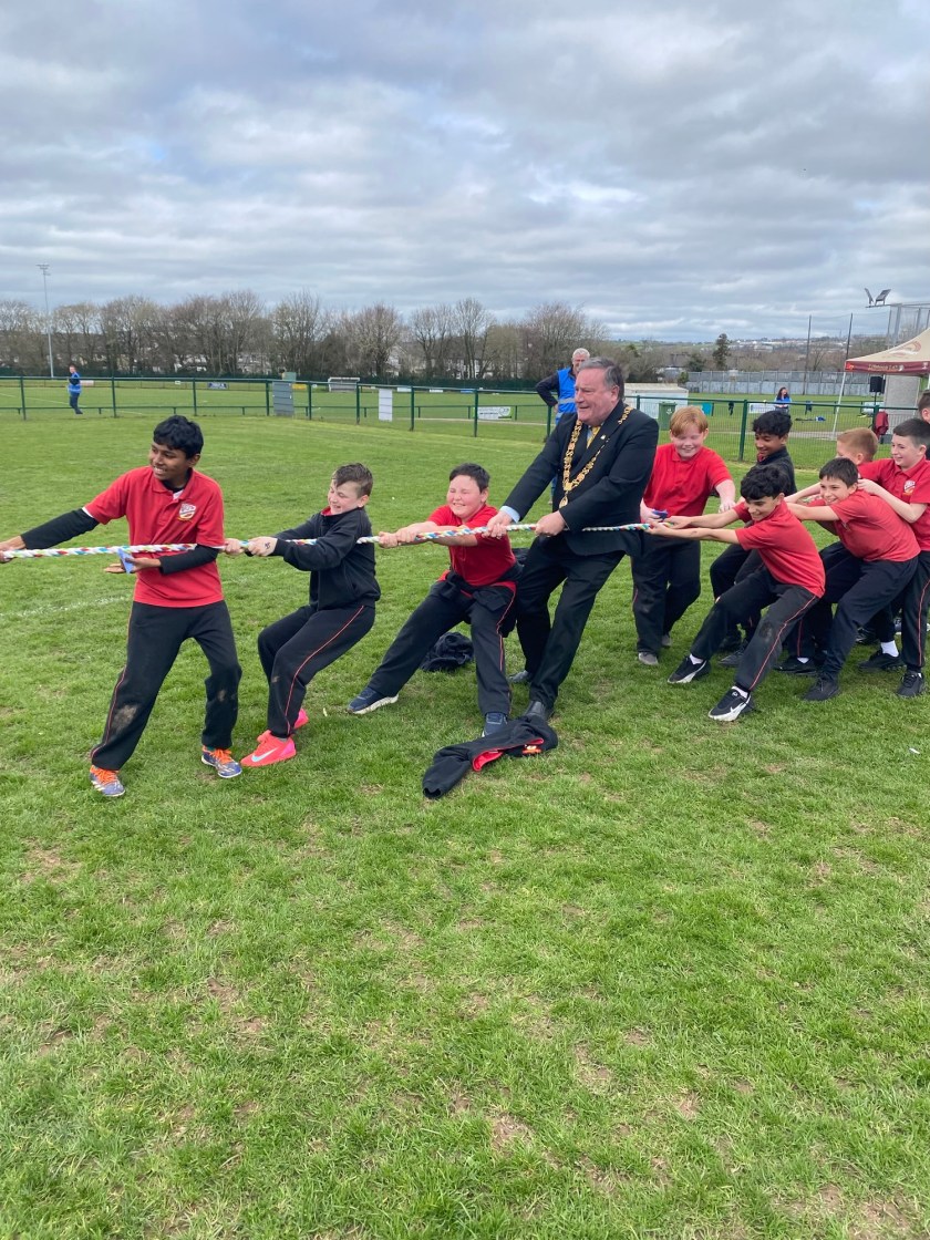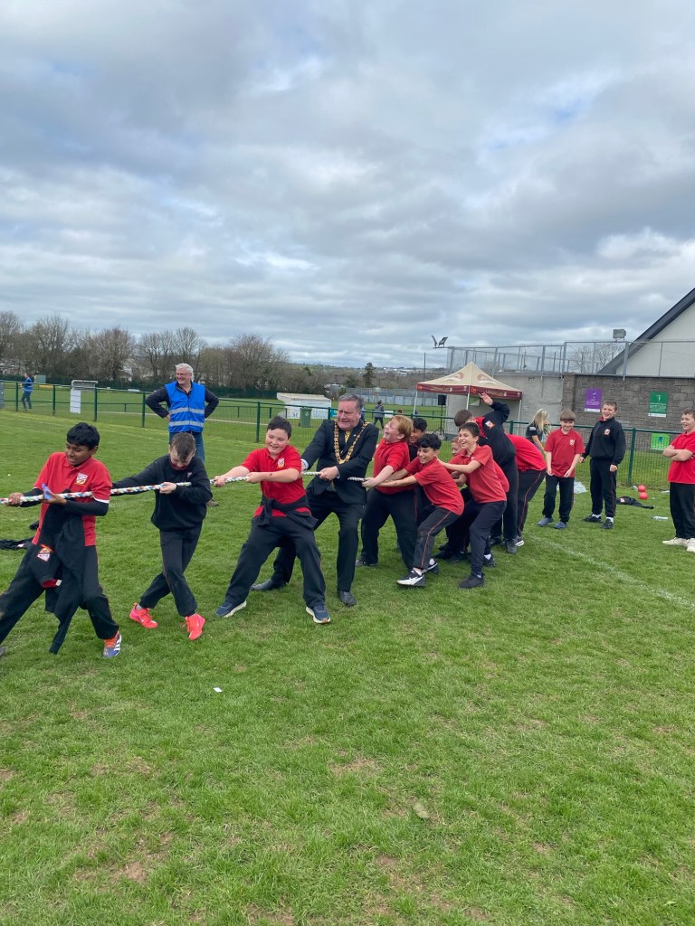 After that we went over to the “arts and crafts” and there was a black sheet and I toothpick and you had to colour it and most people used to stencils but I didn’t I just coloured it fully and there was also tattoos and I got a pretty-pretty princess tattoo on my right cheek. Then the Lord Mayor was there and we all got a photograph with him and before we left we had to take a photograph playing tug of war with him. My team won but Cory fell on top of me. When we were leaving Mr. Collins got a load of Easter Eggs and he is going to give them out a hometime.